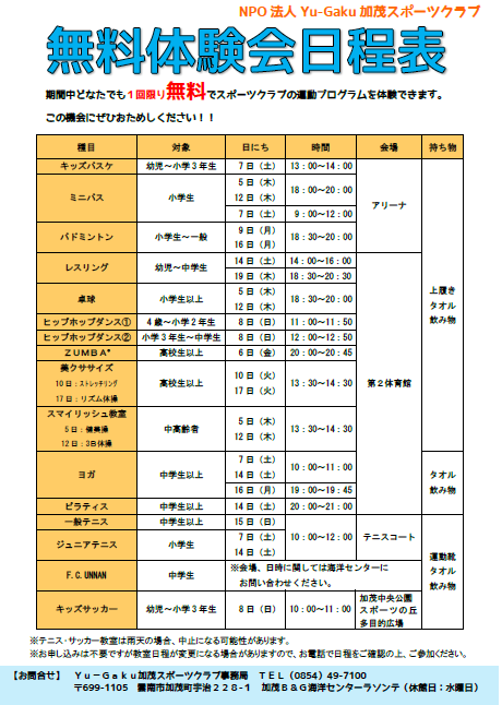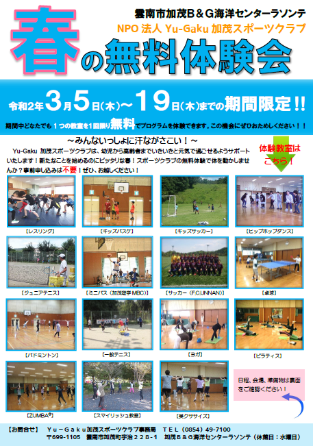 Yu-Gaku加茂スポーツクラブ 春の無料体験会開催!! 更新日:2020年2月25日 いつも、Yu-Gaku加茂スポーツクラブをご利用いただきましてありがとうございます。今年も、スポーツクラブ春の無料体験会を開催します。少しずつ暖かくなり、体を動かす準備をするこの季節!新しいことを始めるのにぴったりなこの季節!!快適な春を迎えるために、ぜひ、一緒に体を動かしませんか?日程表をご確認の上、お越しください。皆様のお越しをお待ちしております!!