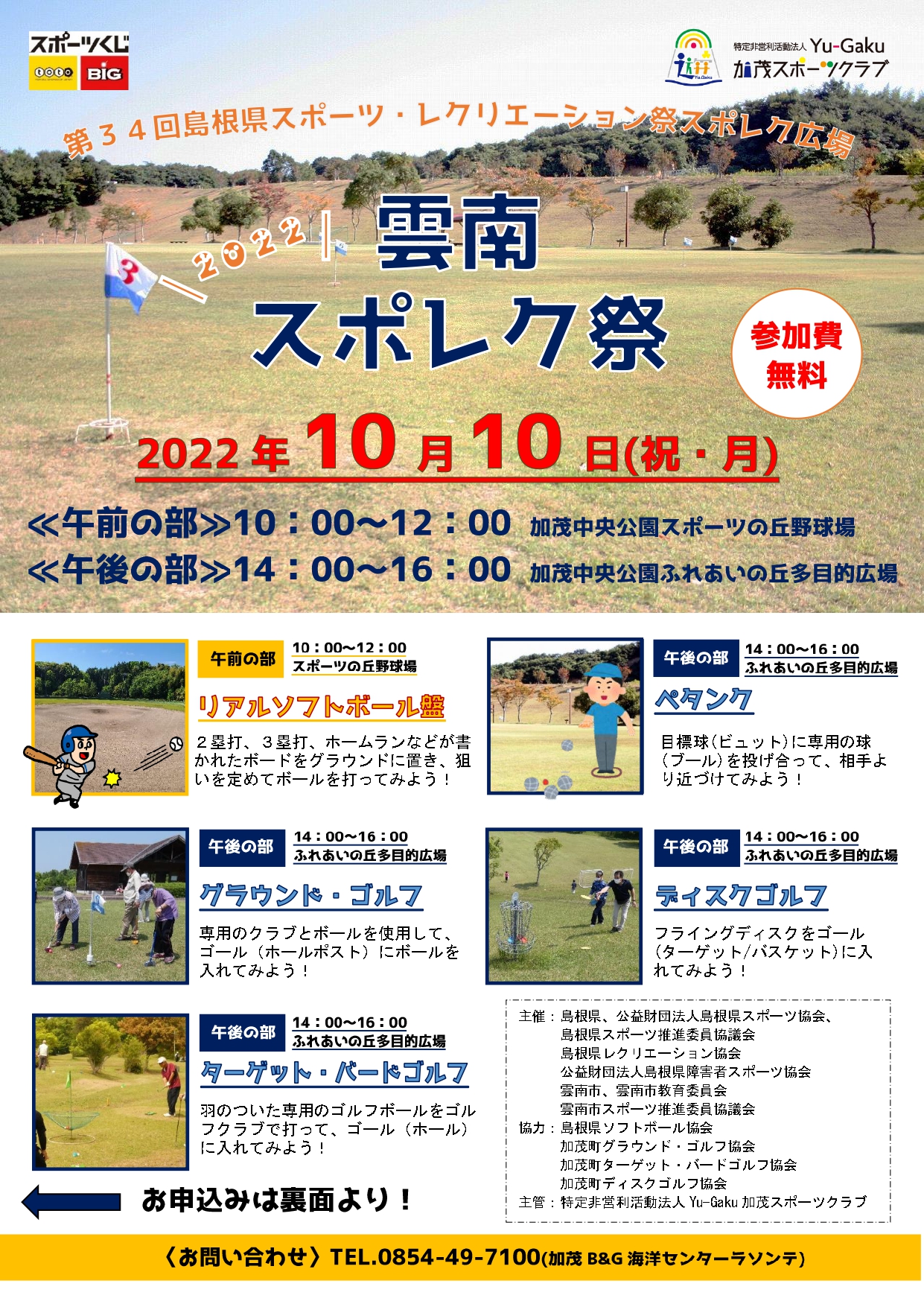 10月10日(祝・月)、加茂中央公園野球場とふれあいの丘を会場に、地域住民のみなさんに楽しくスポーツ体験をしていただく機会として、「雲南スポレク祭2022」を開催します。レクリエーションスポーツはルールが解りやすく、子どもから高齢者まで一緒に楽しめる種目となっています。友達同士や親子でもこの機会に是非お気軽にご参加ください!
