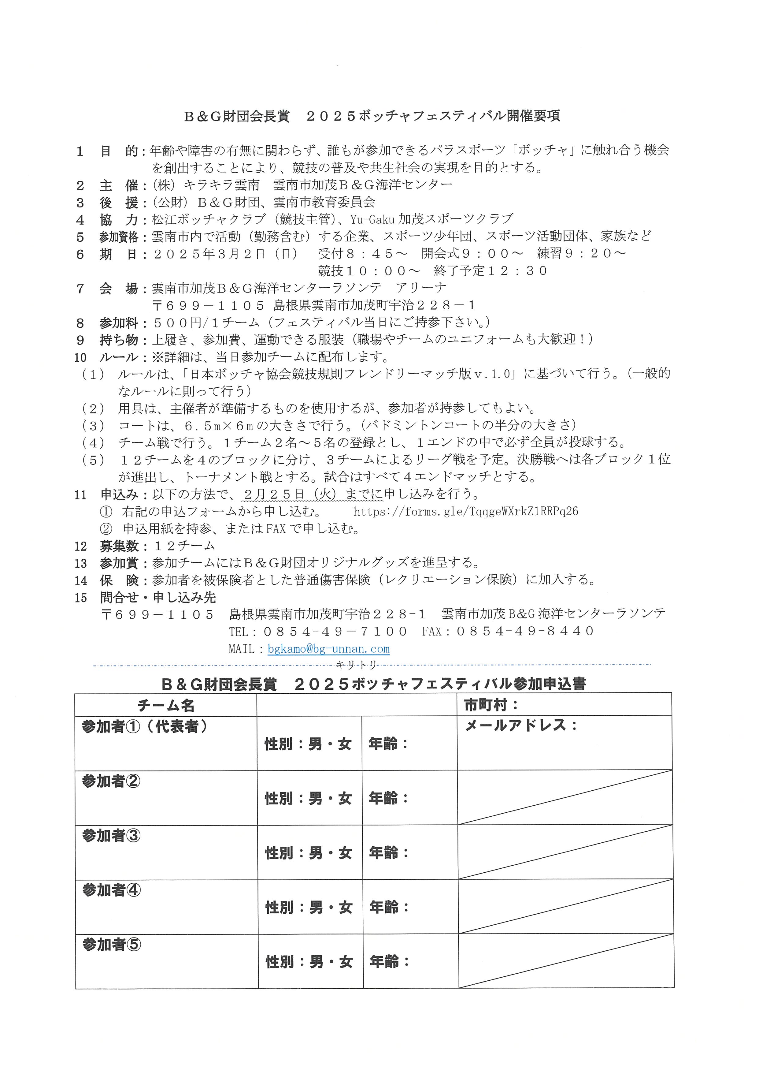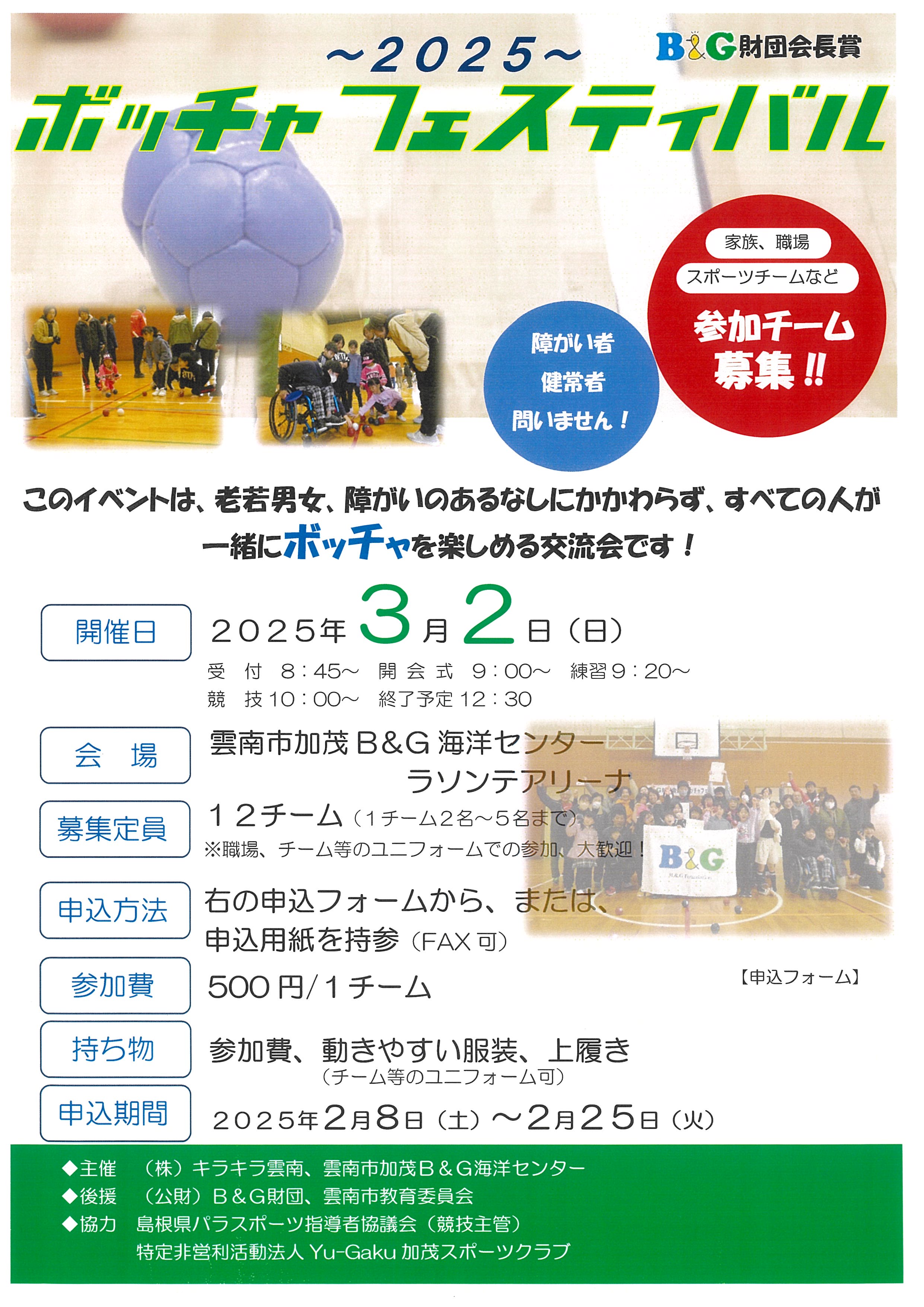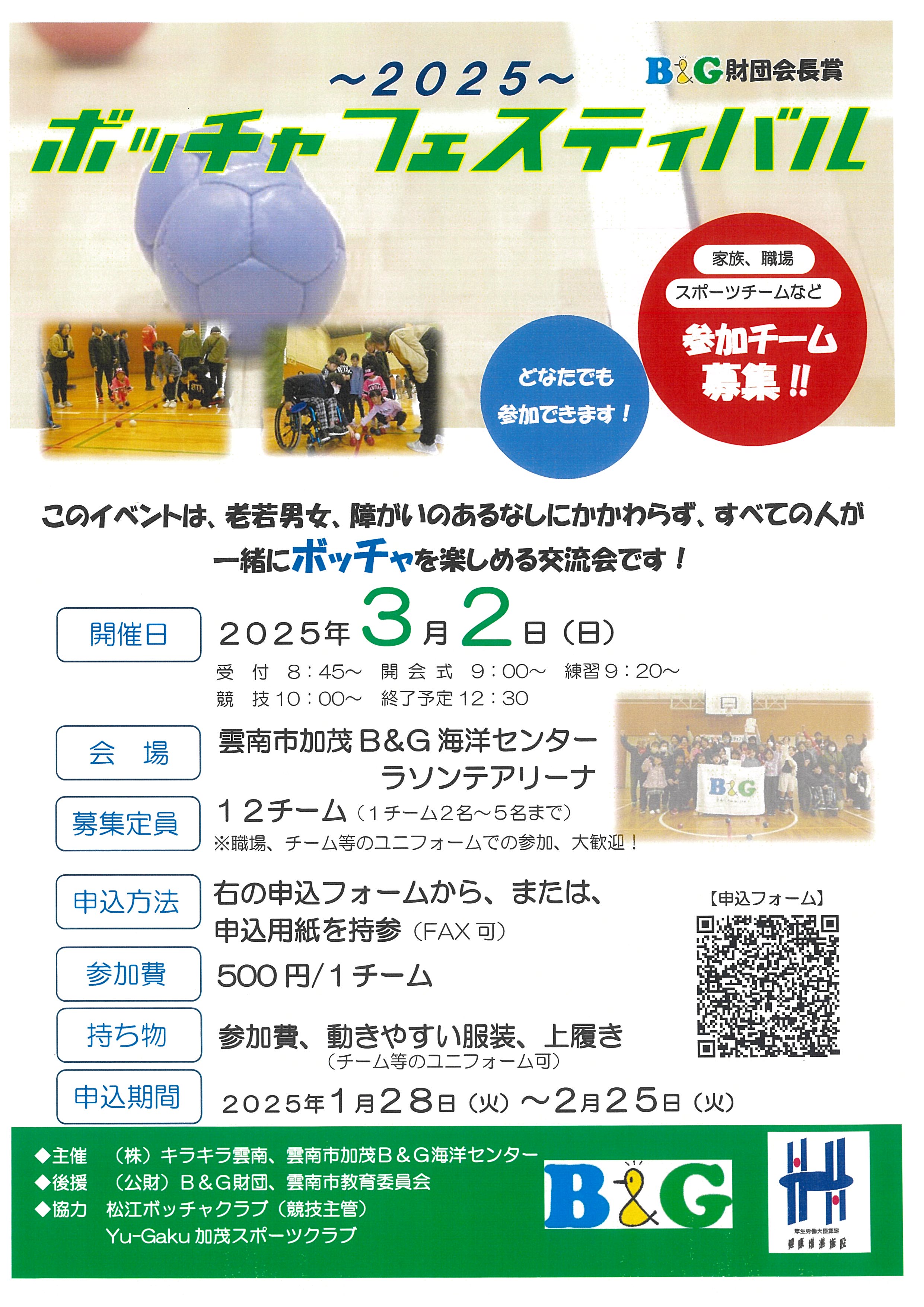 ~2025~B&G財団会長杯ボッチャフェスティバル開催!! 更新日:2025年2月7日 雲南市加茂B&G海洋センターラソンテでは、昨年ご好評いただいたボッチャフェスティバルを行います。どなたでも参加可能です!みんなで、楽しみましょう!!詳細は、以下のチラシ、要項をご確認ください!お申し込みは、下記のURLから、もしくはFAXでできます! https://forms.gle/TqqgeWXrkZ1RRPq26 皆様のお申込みをお待ちしております!