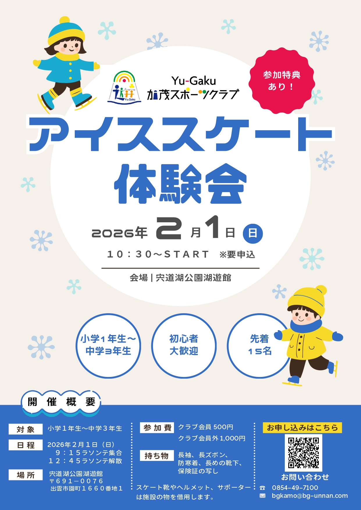 Yu-Gaku加茂スポーツクラブ スケート体験会開催のお知らせ 更新日:2026年1月4日 明けまして、おめでとうございます!本年も、Yu-Gaku加茂スポーツクラブの教室に参加し、楽しく元気に過ごしましょう!どうぞ、よろしくお願いいたします。 さて、スケート体験会のお知らせです。詳細は、写真のチラシと要項をご確認ください。お申し込みは、以下のURL(コピーし、検索してください)からお願いいたします。 https://forms.gle/rYRoPHoE4unfo5u57 先着順ですので、お申し込みはお早めに! 皆様の、お申し込みをお待ちしております。