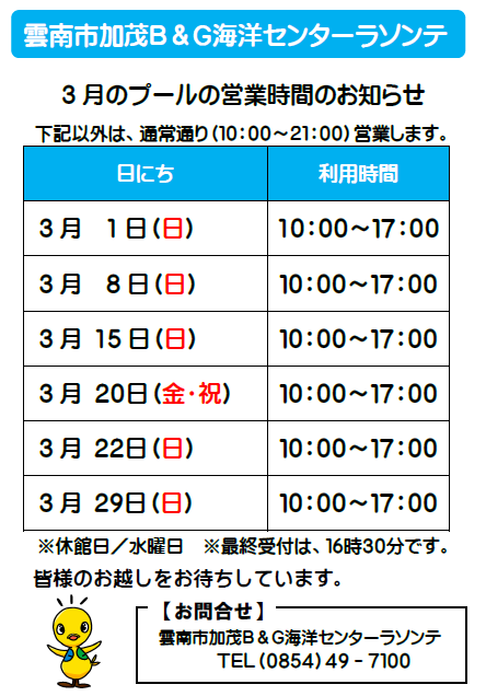 加茂B&G海洋センターラソンテ2020年3月の営業時間について 更新日:2020年2月25日 いつも、加茂B&G海洋センターラソンテをご利用いただきましてありがとうございます。2020年3月の営業時間についてお知らせいたします。ご確認くださいませ!皆様のお越しをおまちしております!
