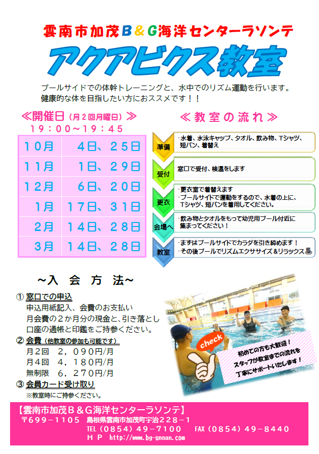 カラダを引き締める!「アクアビクス教室」スタート! 更新日:2022年5月18日 雲南市加茂B&G海洋センターラソンテでは、10月より新しいプログラムの「アクアビクス教室」が始まりました! この教室ではカラダを引き締める運動や、水中で音楽に合せたエクササイズを中心に行います! 軽やかで健康的な体作りを目指す方にぜひおススメです‼ ぜひ参加してみませんか?