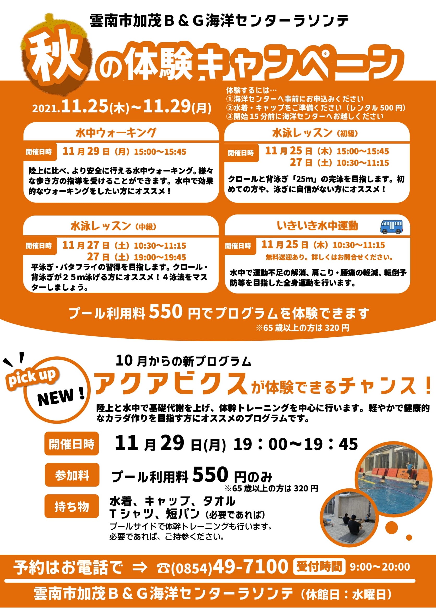 当センターでは、2021年11月25日(木)~11月29日(月)の期間、プール利用料(一般/550円、65歳以上/320円)のみでプールプログラムを体験できるキャンペーンを開催します。