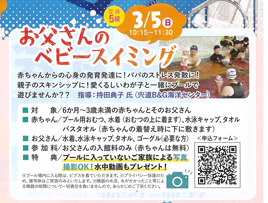 いつも加茂B&G海洋センターラソンテをご利用いただき、ありがとうございます。加茂B&G海洋センターラソンテでは、3月5日(日)10:15~、先着5組様限定で「お父さんのベビースイミング」を行います。愛くるしいわが子と一緒に温水プールで遊びませんか?当日は、家族による写真撮影もでき、希望者には水中動画もプレゼントします。参加費は大人のプール入水料のみで、お子様は無料です。