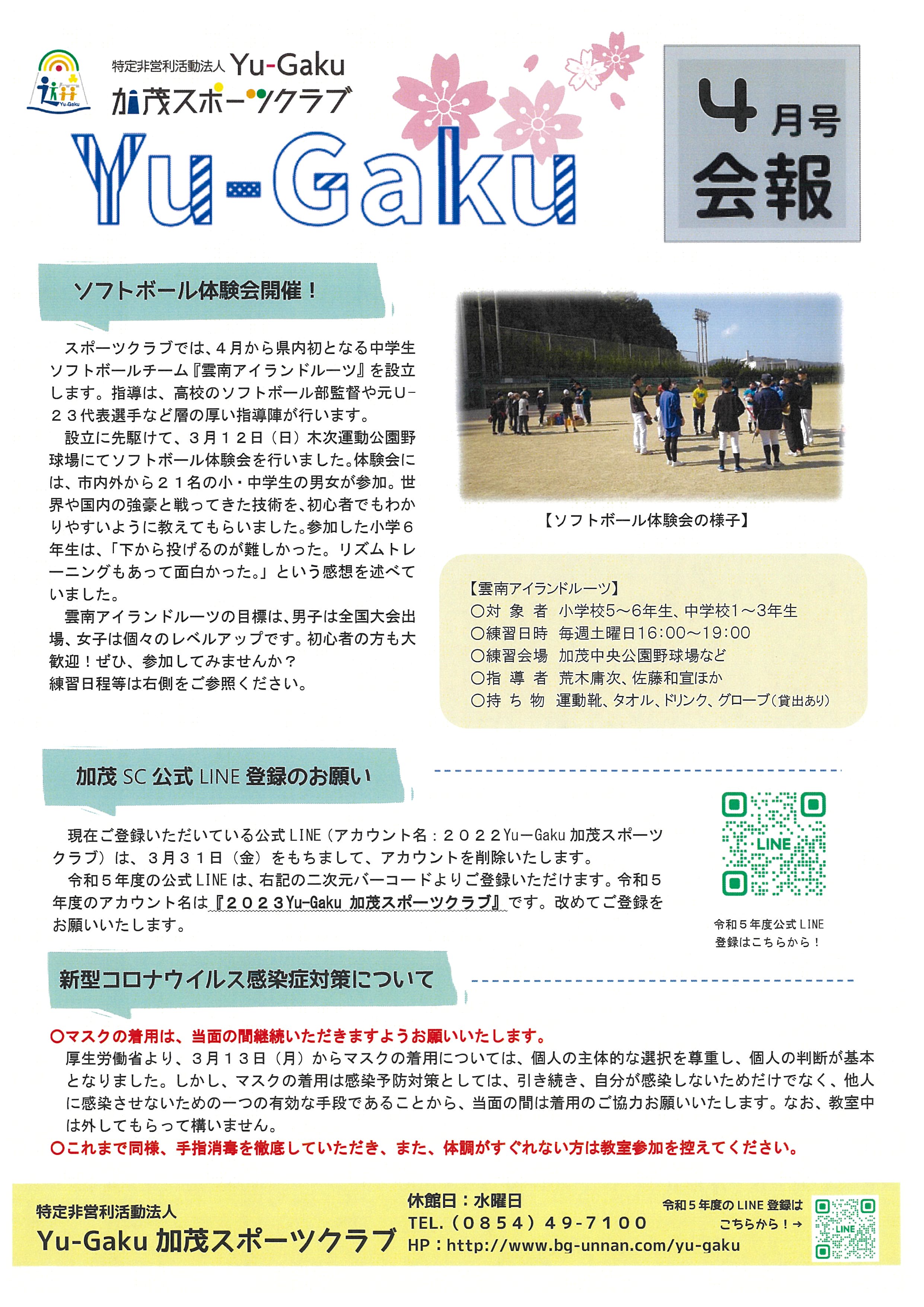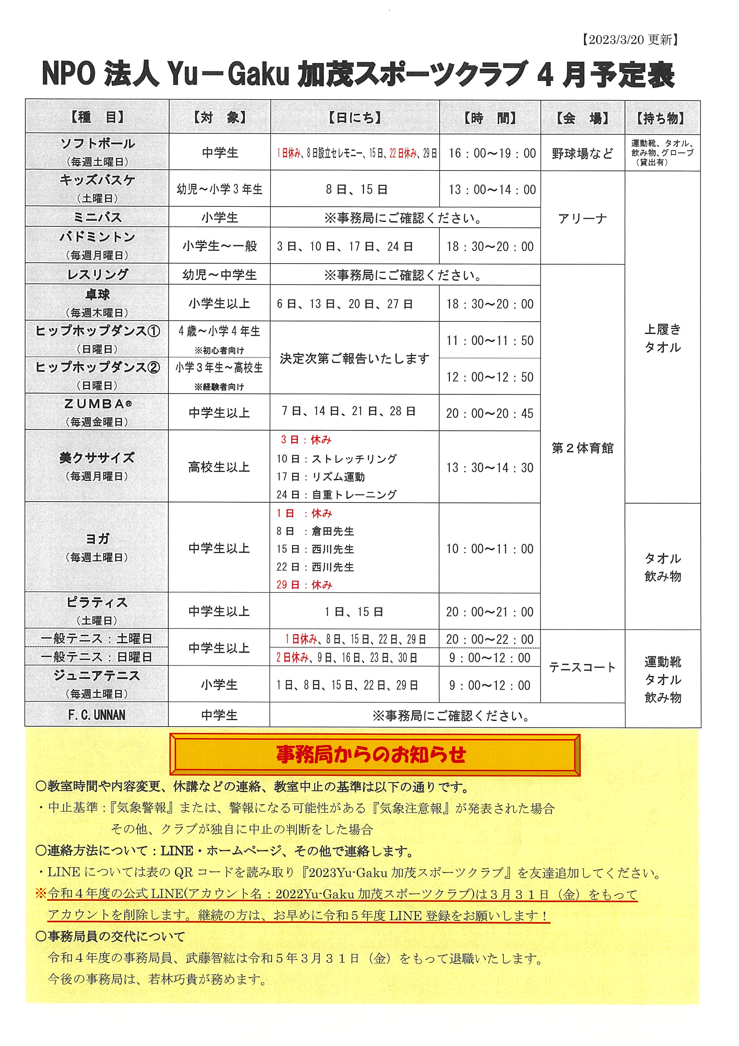 Yu-Gaku加茂スポーツクラブ令和5年4月会報&日程表について 更新日:2023年3月19日 いつも、Yu-Gaku加茂スポーツクラブの教室にご参加いただきありがとうございます。 令和5年4月の会報と日程表をアップしますので、ご確認ください。