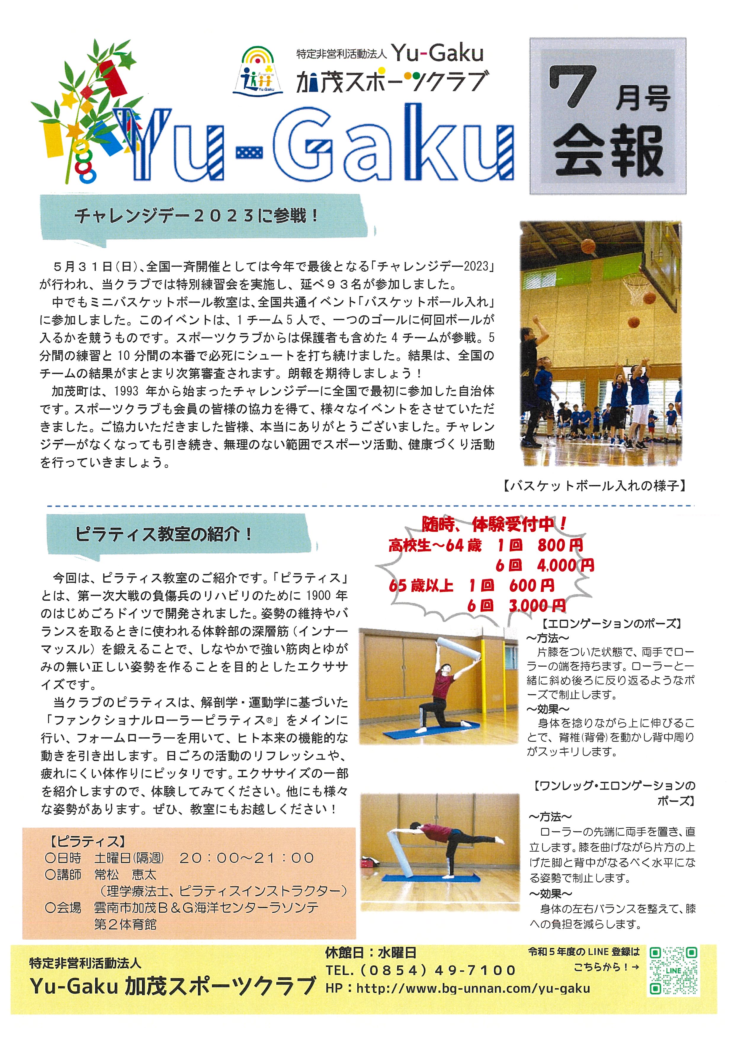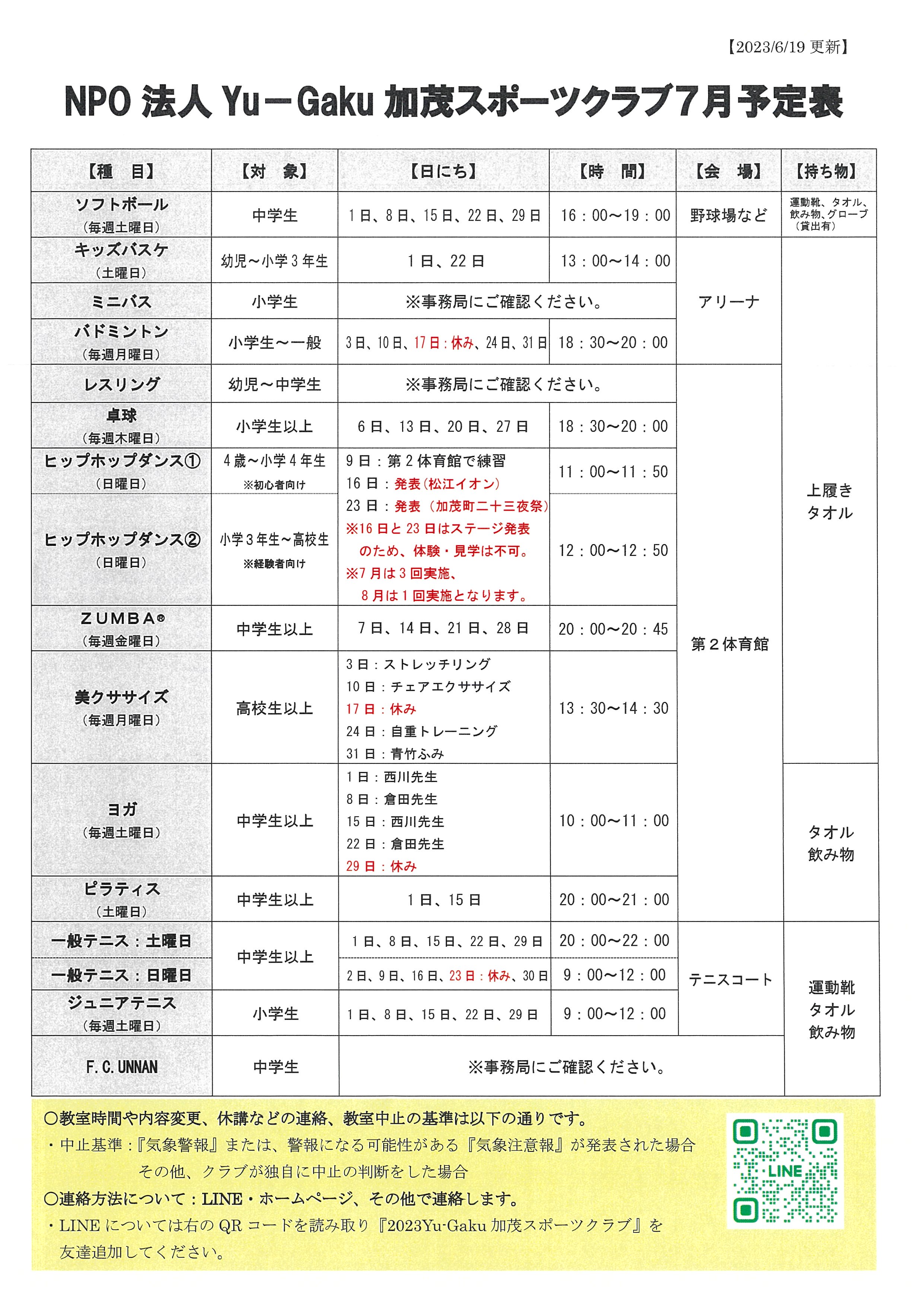Yu-Gaku加茂スポーツクラブ令和5年7月会報&日程表について 更新日:2023年6月19日 いつも、Yu-Gaku加茂スポーツクラブの教室にご参加いただきありがとうございます。 7月の会報と日程表を掲載します。ご確認ください。 ※おためしチケット購入の際は、教室日の前日までのお買い求めいただきますようお願いいたします。