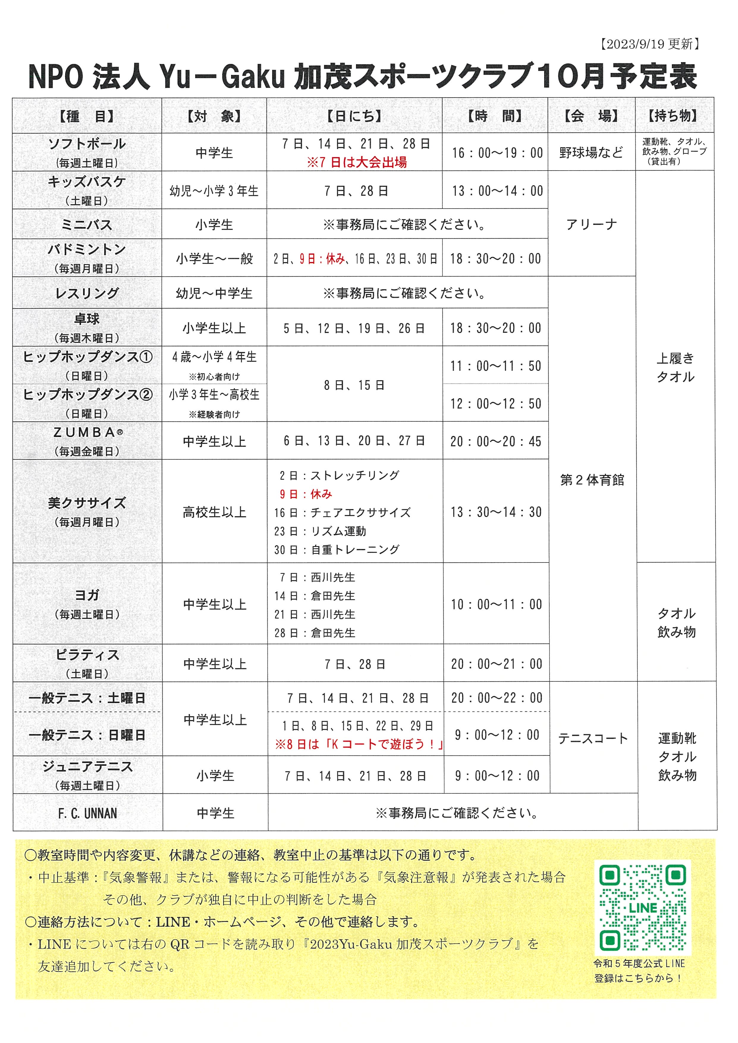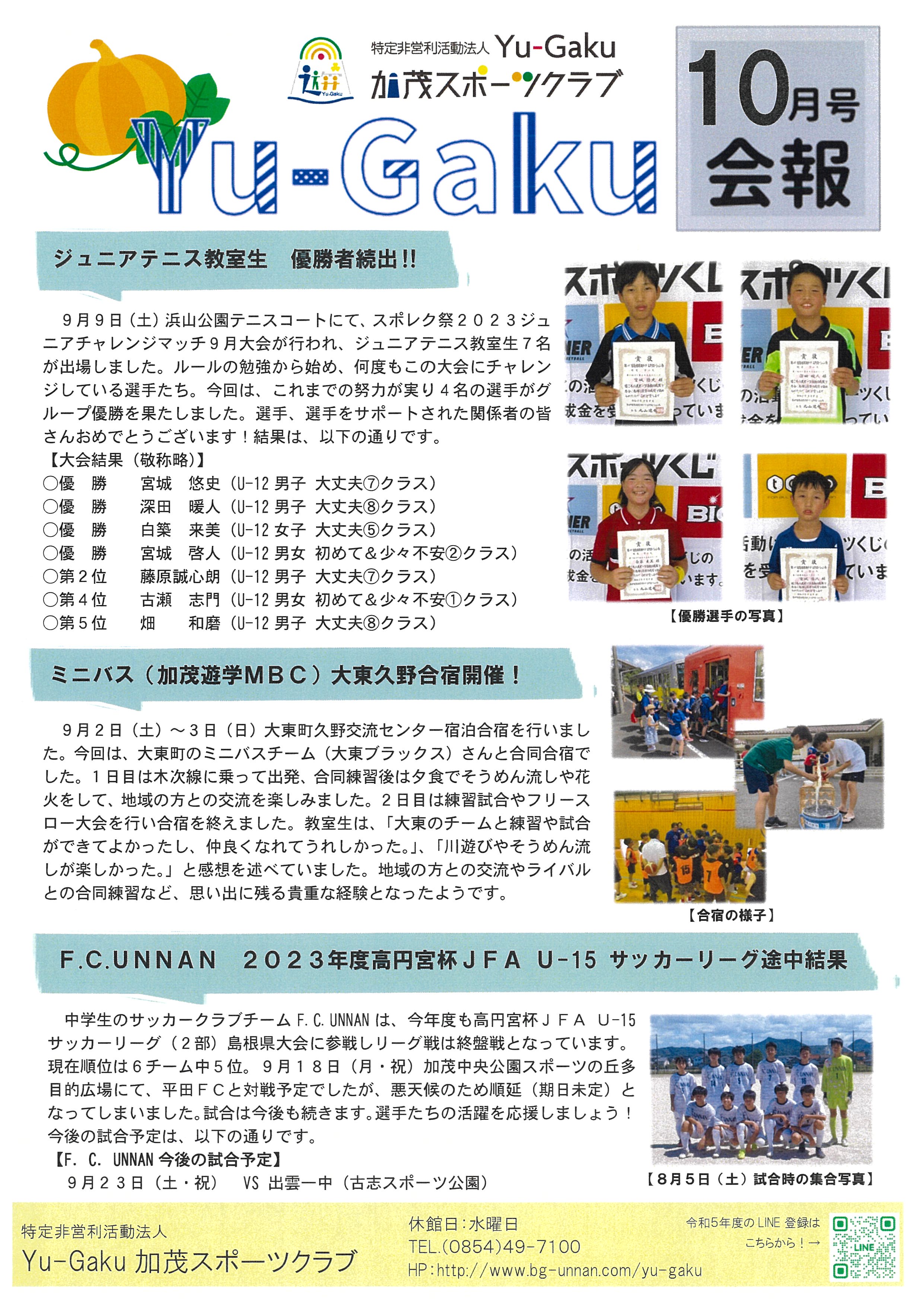 Yu-Gaku加茂スポーツクラブ会報10月号&日程表について 更新日:2023年9月22日 Yu-Gaku加茂スポーツクラブの教室にご参加いただき、ありがとうございます。 令和5年10月の会報と日程表をアップします。ご確認ください。