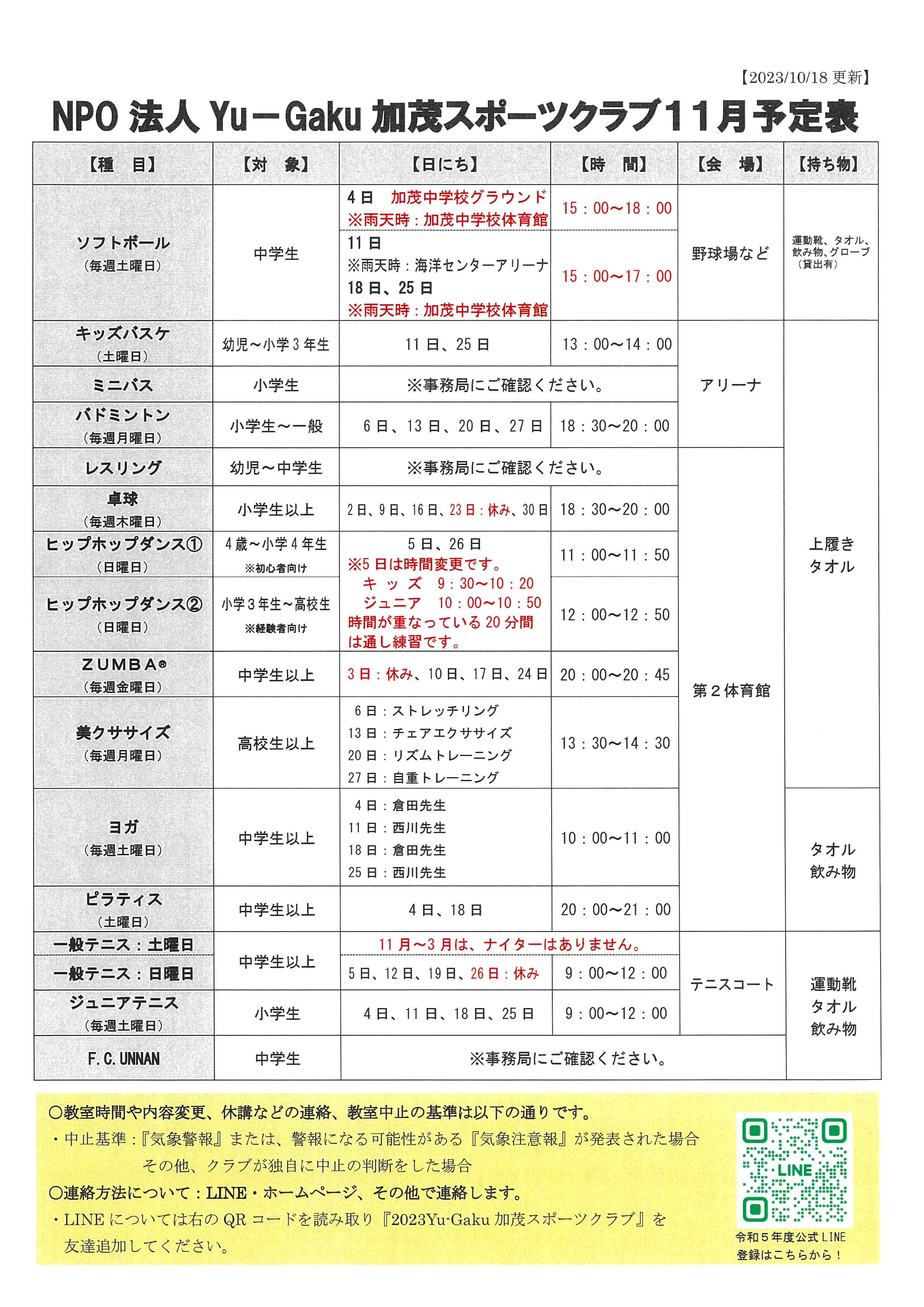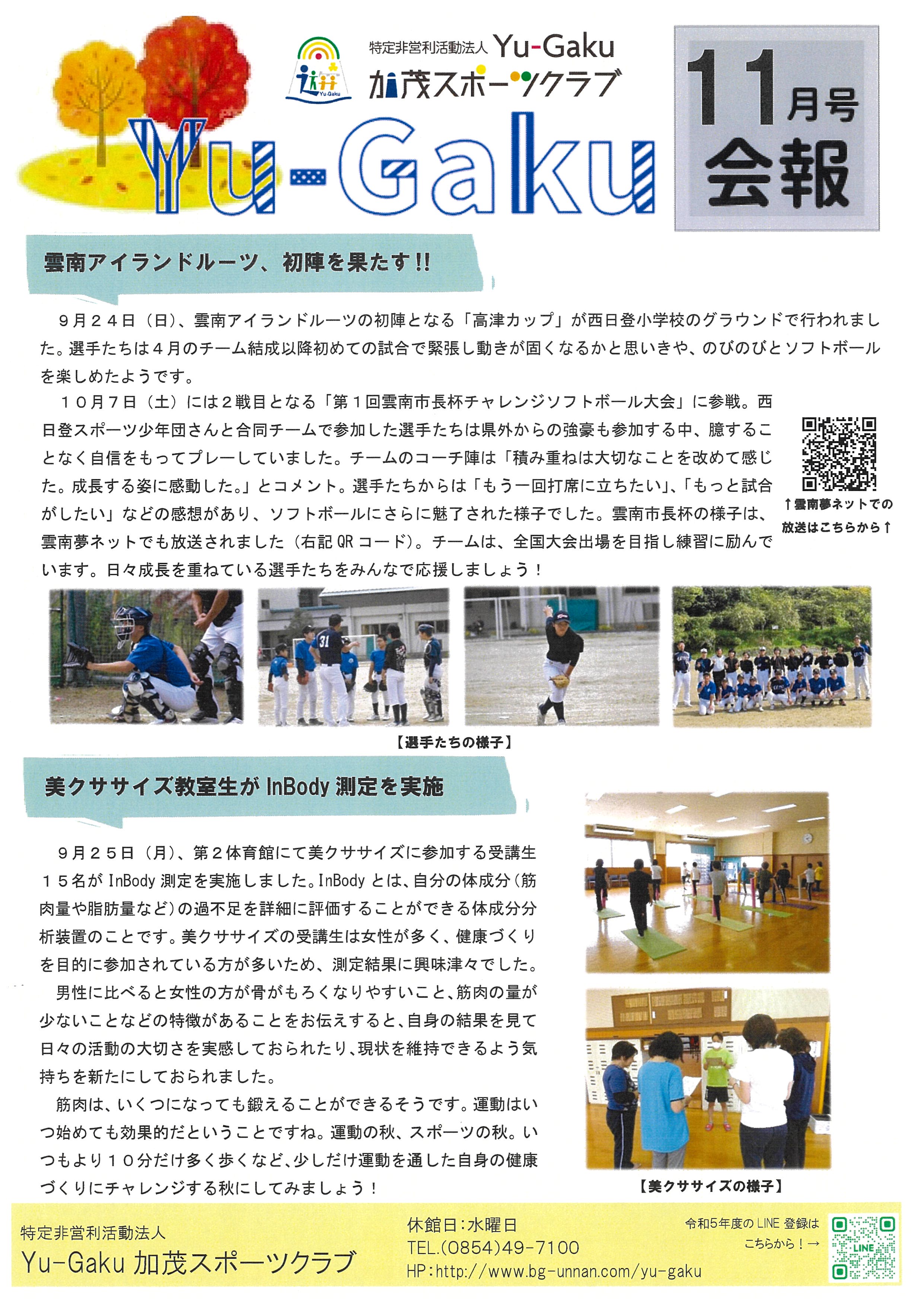 Yu-Gaku加茂スポーツクラブ令和5年11月会報&日程表について 更新日:2023年10月20日 Yu-Gaku加茂スポーツクラブの教室に参加いただき、ありがとうございます。 11月の会報と日程表を掲載します。ご確認ください。