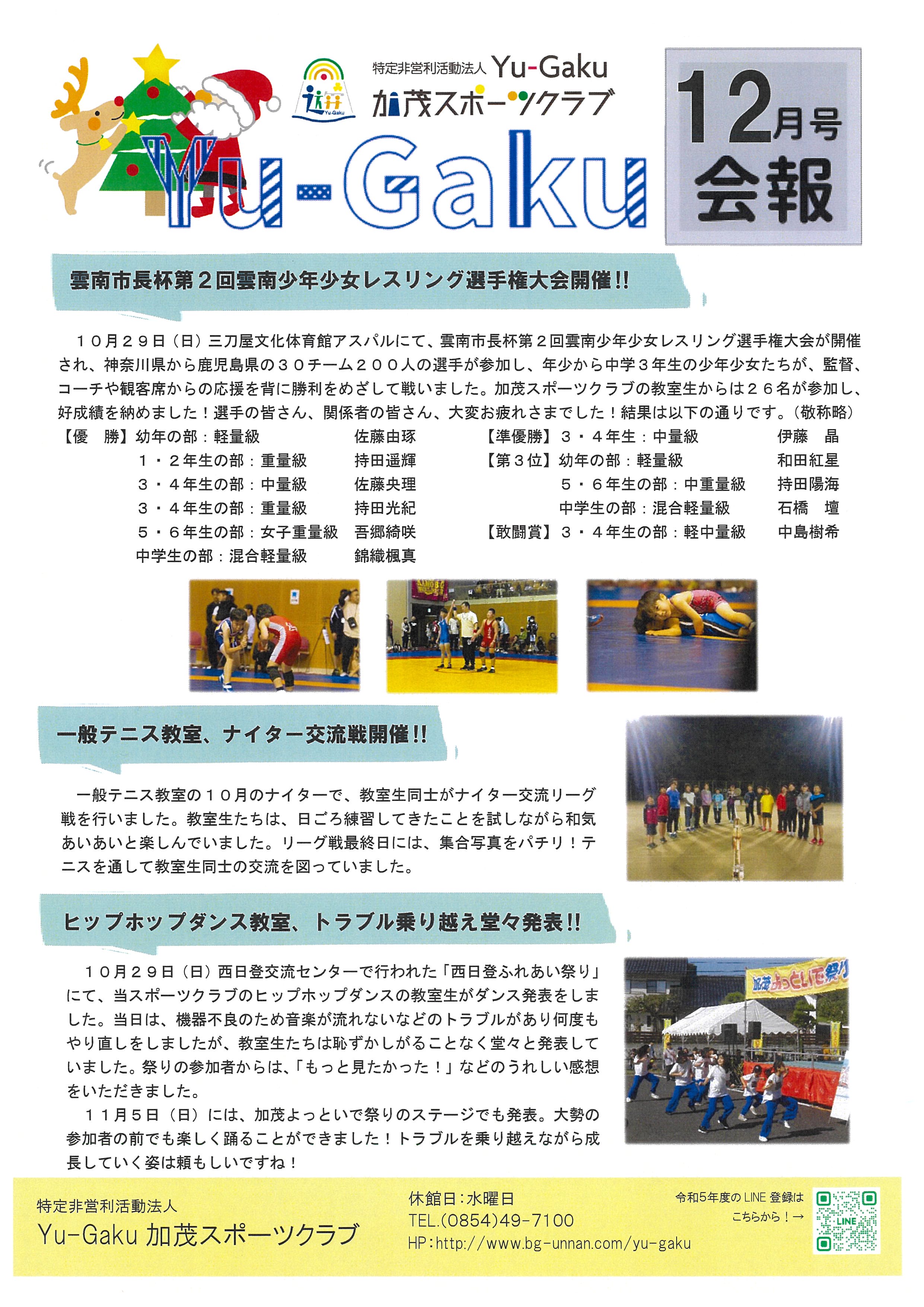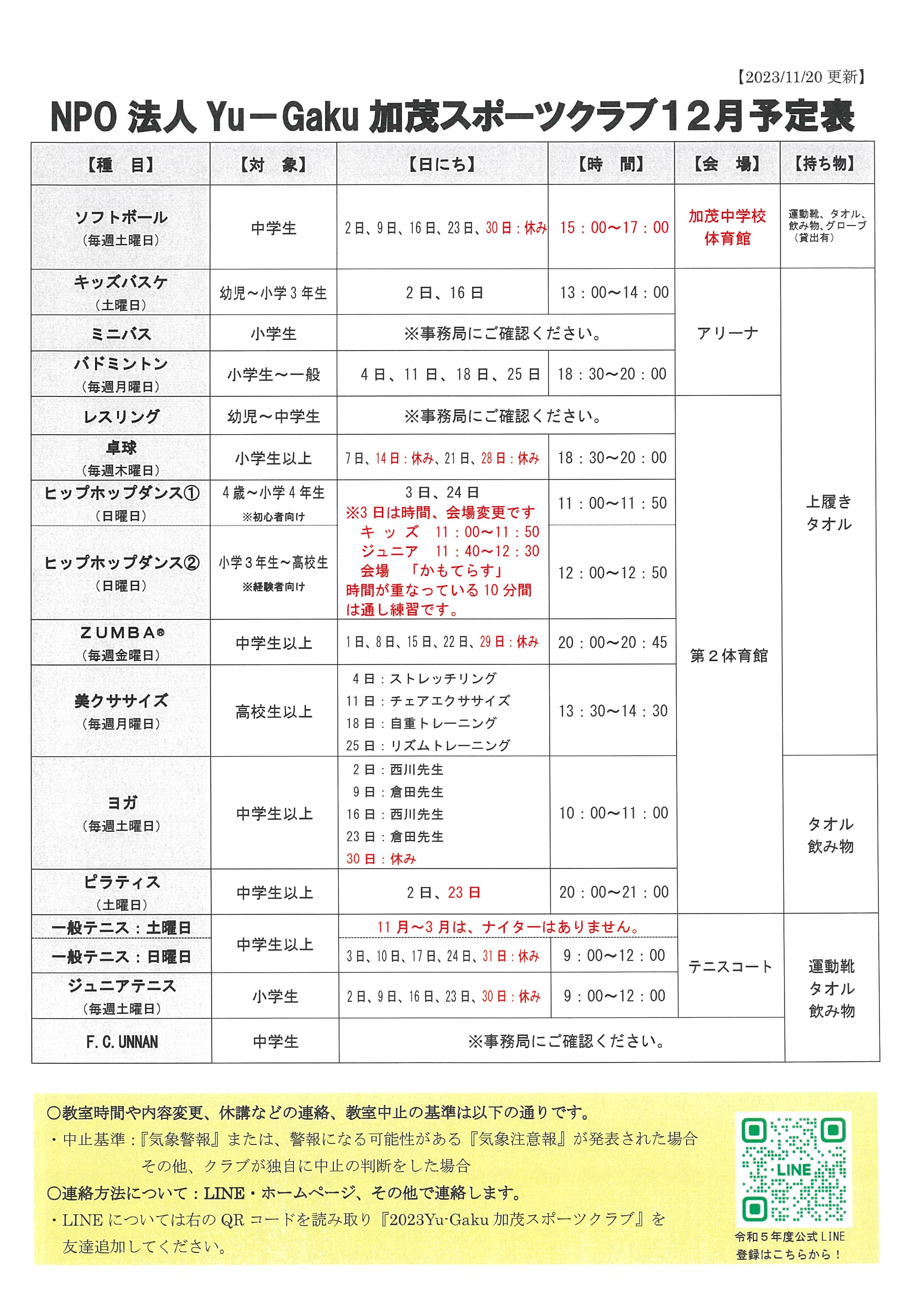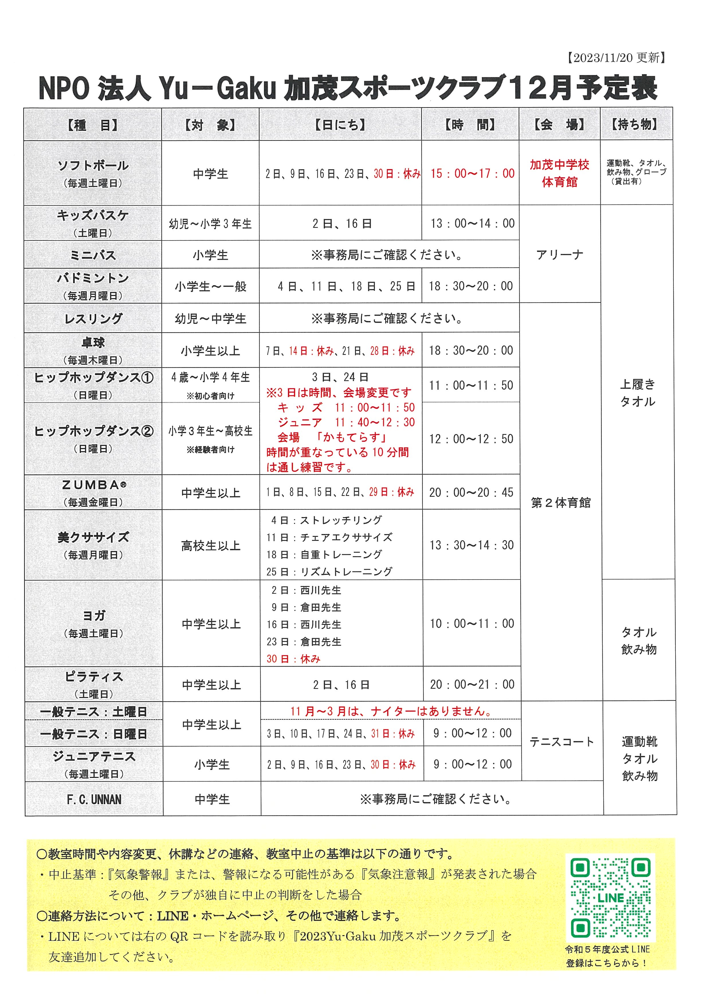 Yu-Gaku加茂スポーツクラブ12月会報&日程表について 更新日:2023年11月23日 12月のピラティス教室が、変更になりました。正しくは、以下をご確認ください。 Yu-Gaku加茂スポーツクラブの教室に参加いただき、ありがとうございます。 12月の会報と日程表を掲載します。ご確認ください。