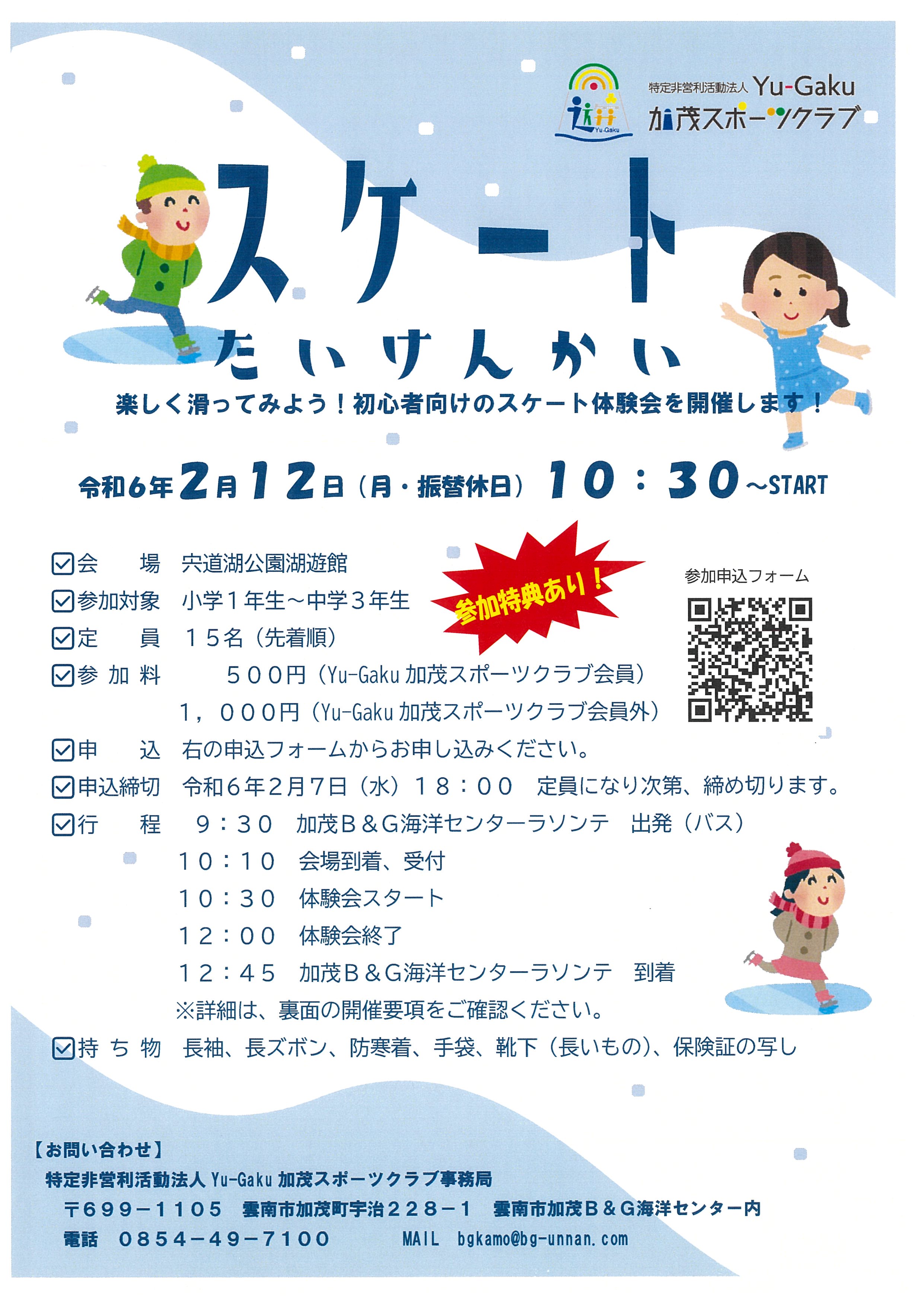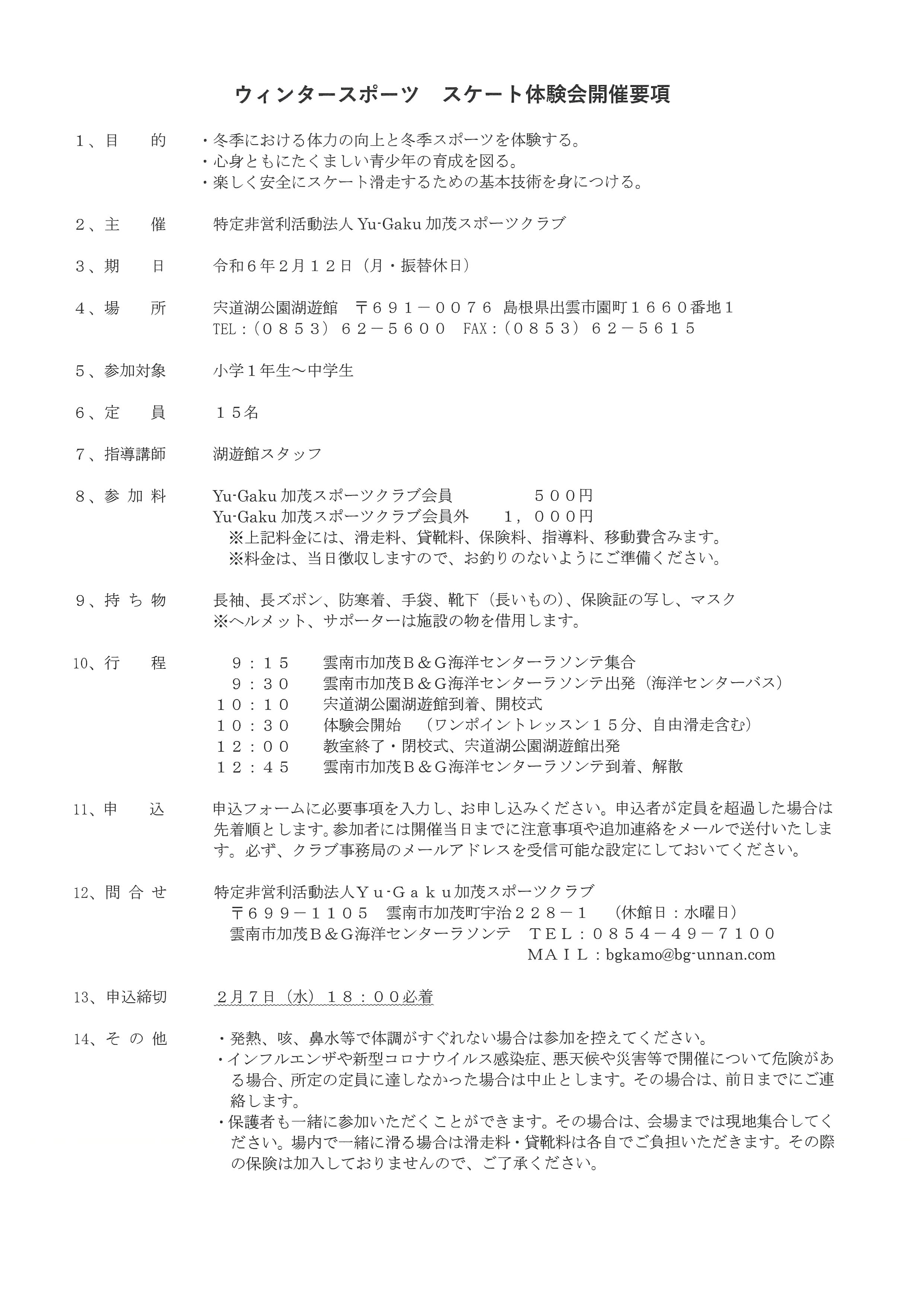 ウィンタースポーツ「スケート体験会」のお知らせ 更新日:2024年1月15日 Yu-Gaku加茂スポーツクラブの教室にご参加いただきありがとうございます!ウィンタースポーツ『スケート体験会』のご案内です!詳細は、チラシ、要項をご確認ください!申込締切は2/7(水)です!皆様のお申し込みをお待ちしております! 申込URL https://forms.gle/DB3Hny1Runupb3t86