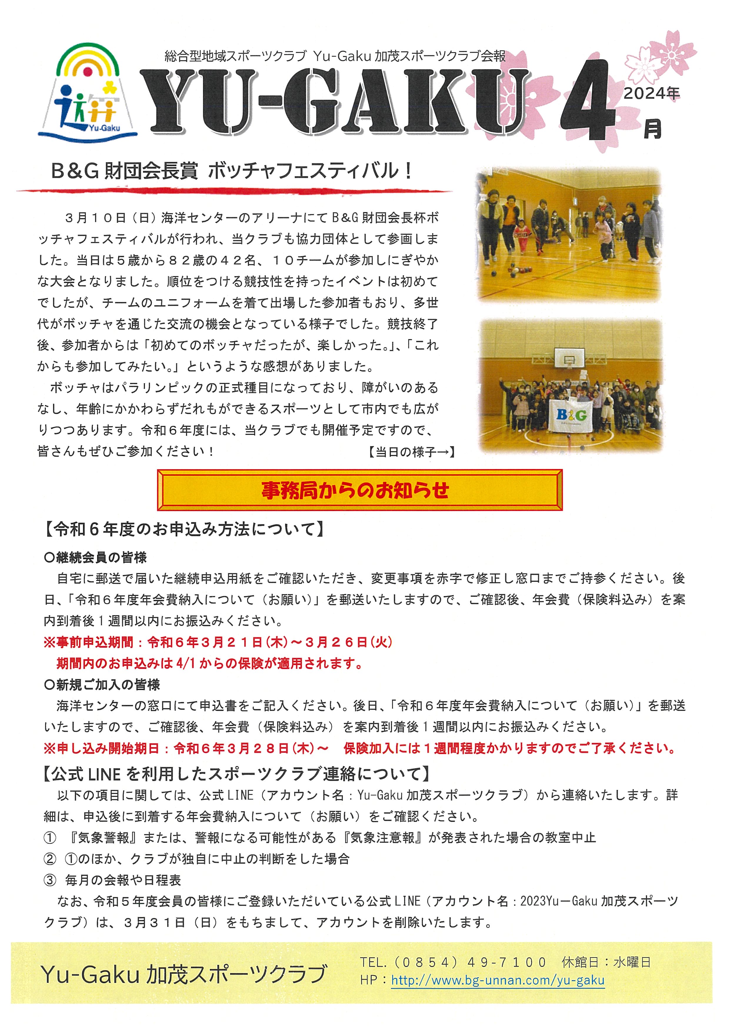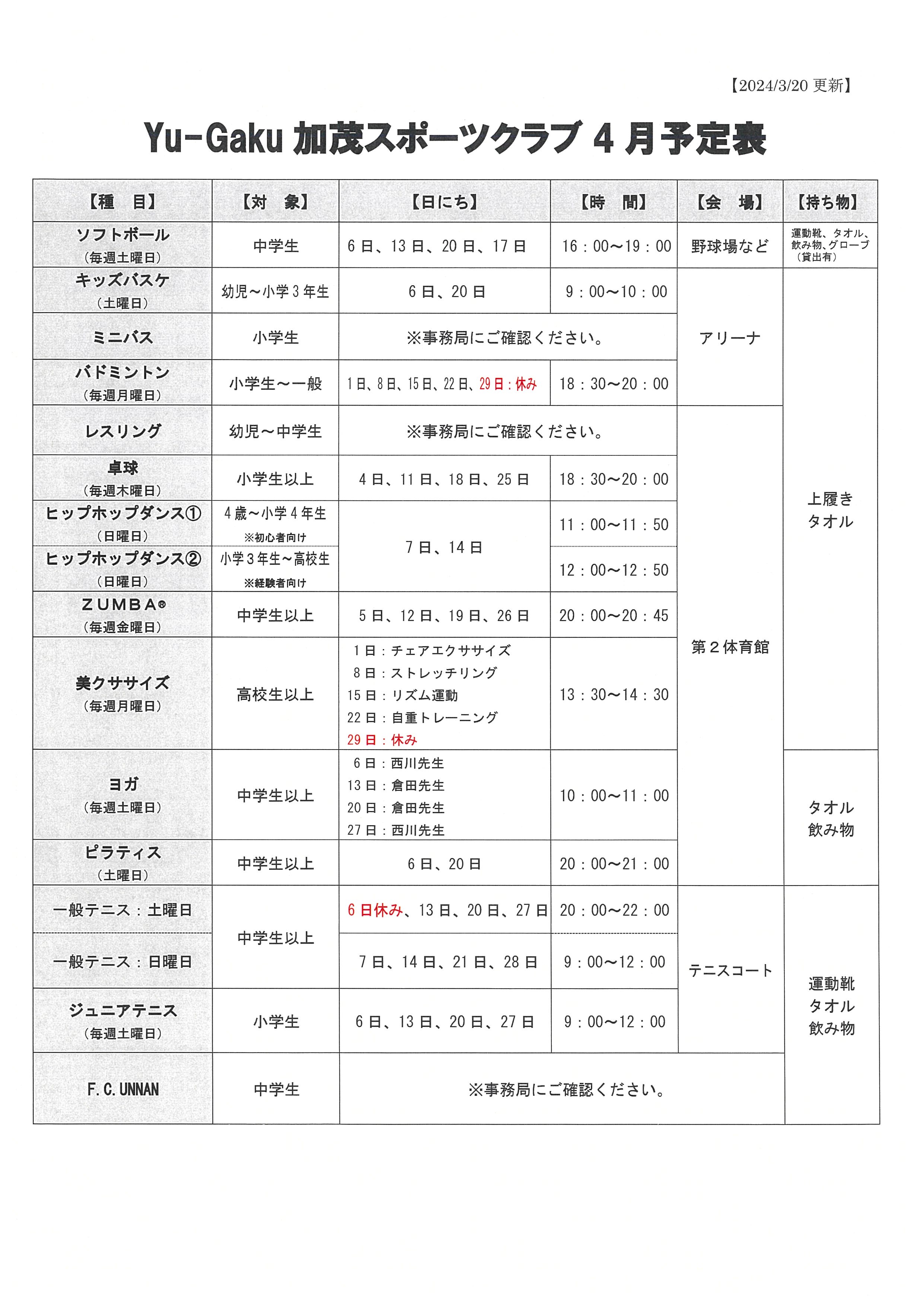 Yu-Gaku加茂スポーツクラブR6年4月号会報&予定表 更新日:2024年3月31日 Yu-Gaku加茂スポーツクラブの教室にご参加いただきましてありがとうございます。 R6年4月号会報&日程表です。ご確認ください。