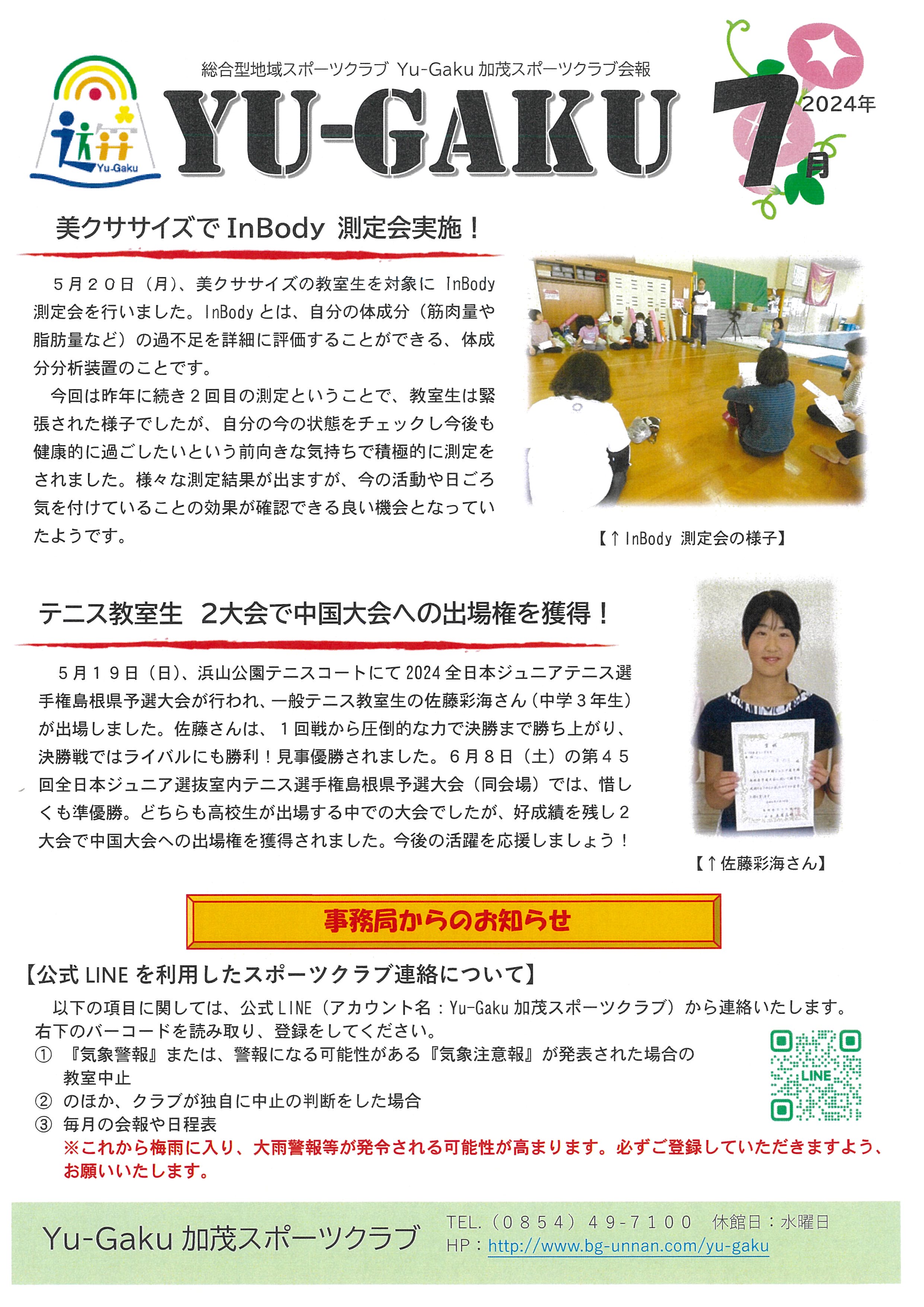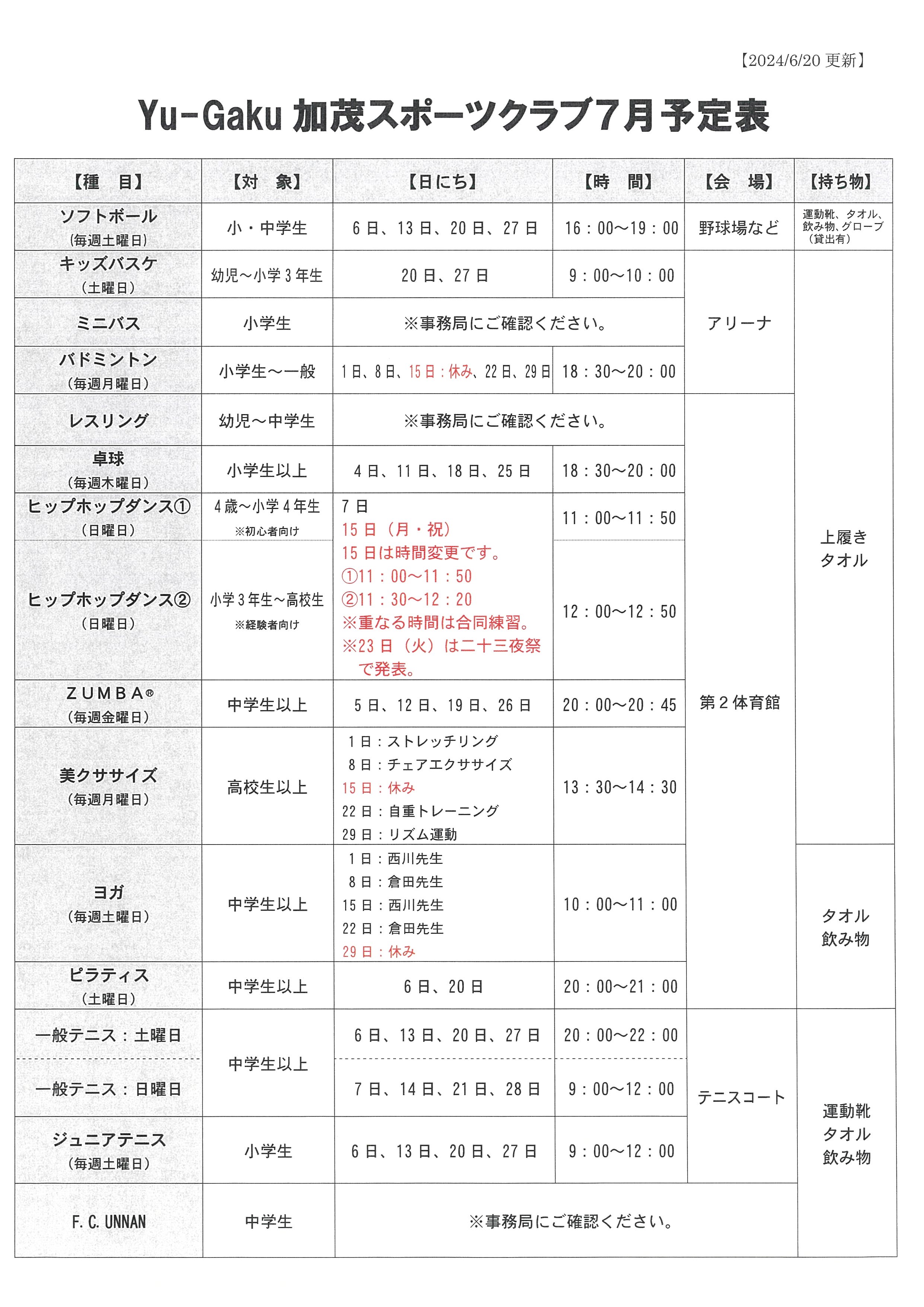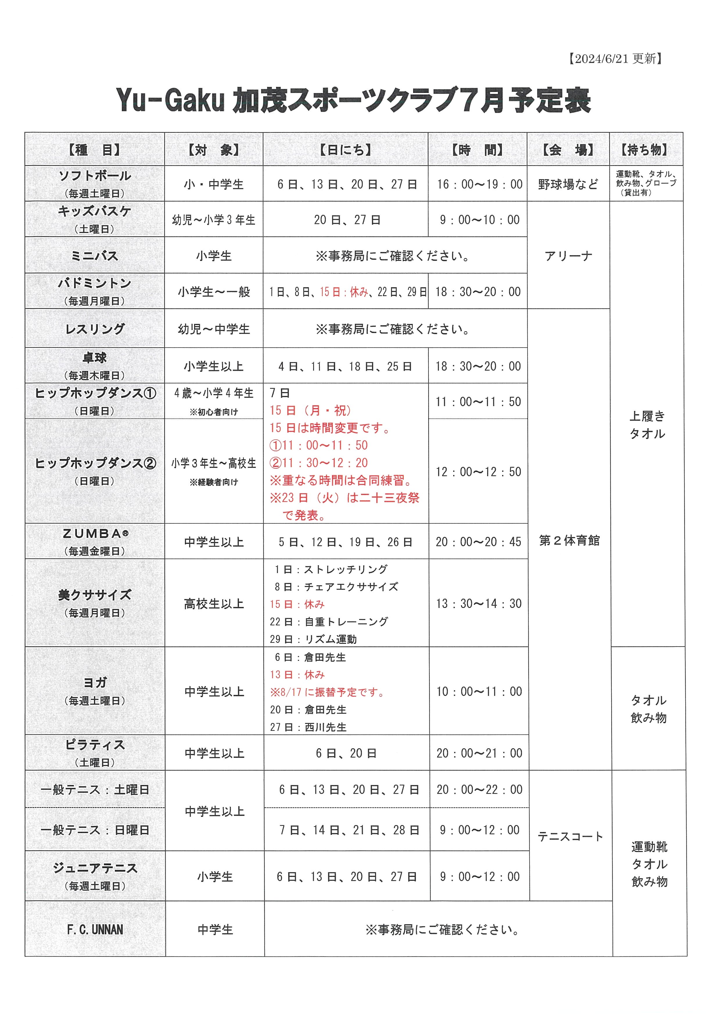 Yu-Gaku加茂スポーツクラブ会報7月号&日程表について 更新日:2024年6月21日 Yu-Gaku加茂スポーツクラブの教室にご参加いただき、ありがとうございます。スポーツクラブ会報7月号&日程表についてアップします。ご確認ください! 熱中症や大雨の危険性が高まる時期となってきました。ご参加の際は、くれぐれもお気を付けください!