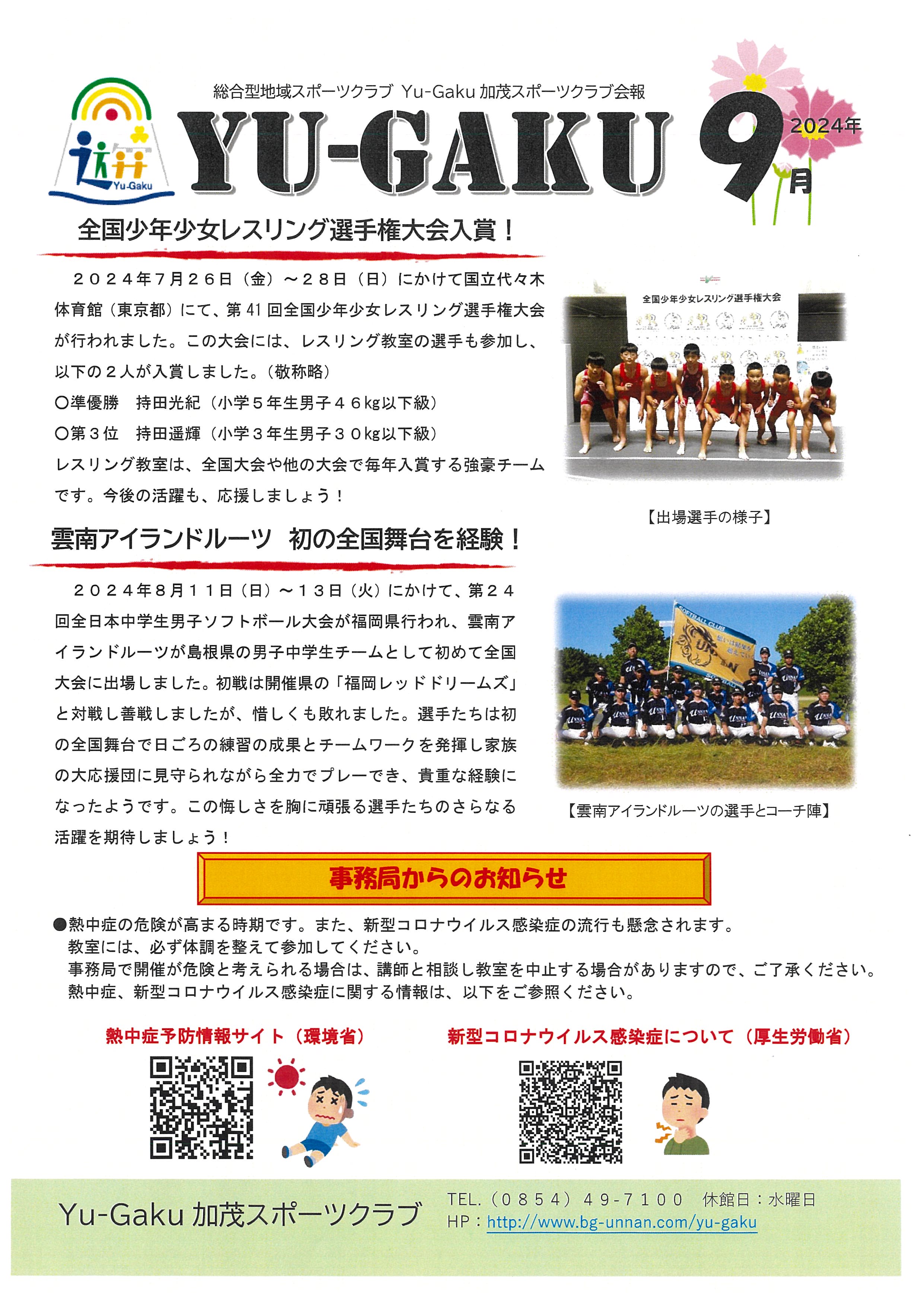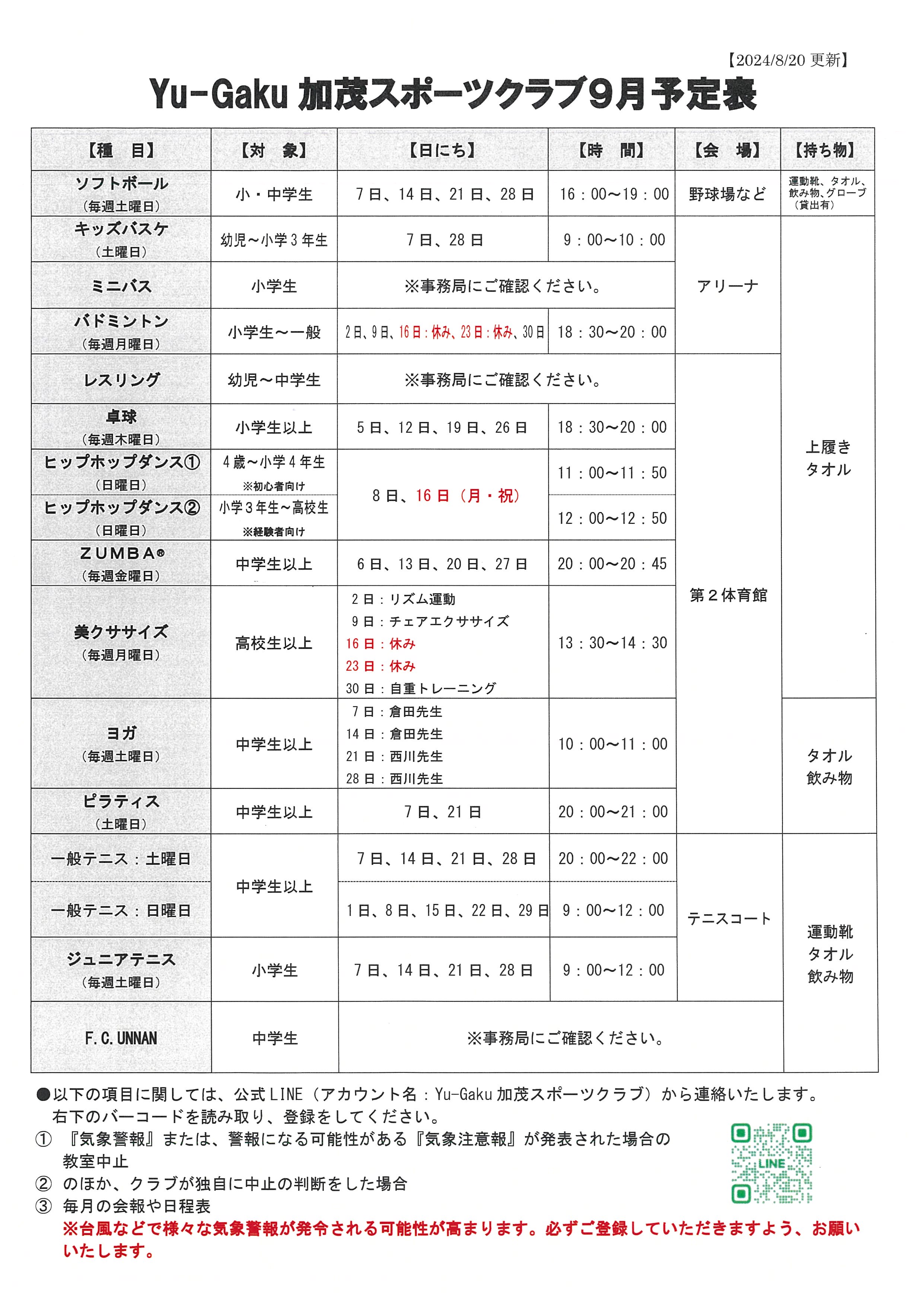 Yu-Gaku加茂スポーツクラブ9月会報&日程表について 更新日:2024年8月20日 Yu-Gaku加茂スポーツクラブの教室にご参加いただきありがとうございます。9月会報と日程表をアップします!ご確認ください!