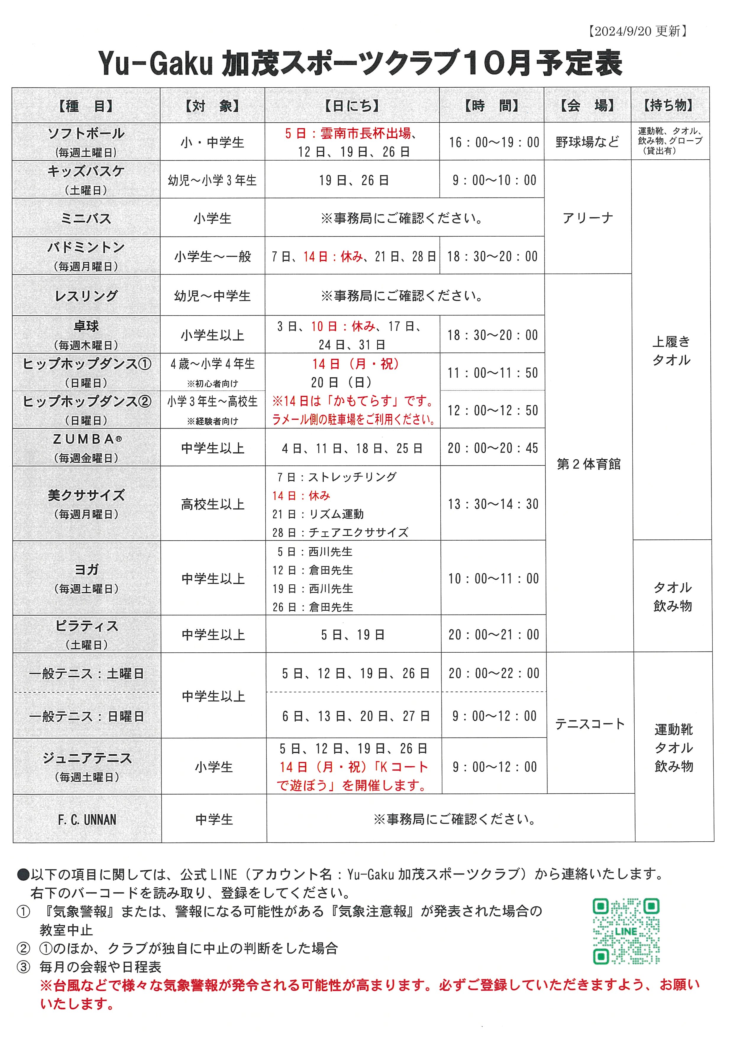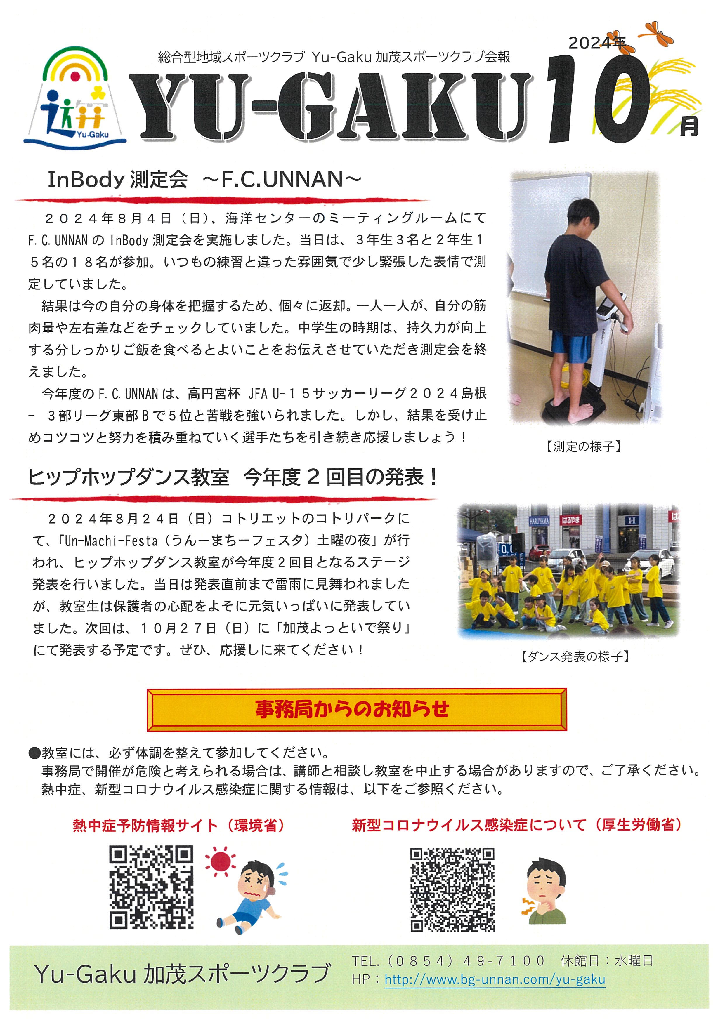 Yu-Gaku加茂スポーツクラブ 令和6年度10月会報&日程表について 更新日:2024年9月20日 Yu-Gaku加茂スポーツクラブの教室にご参加いただきありがとうございます。10月会報と日程表をアップします!ご確認ください!