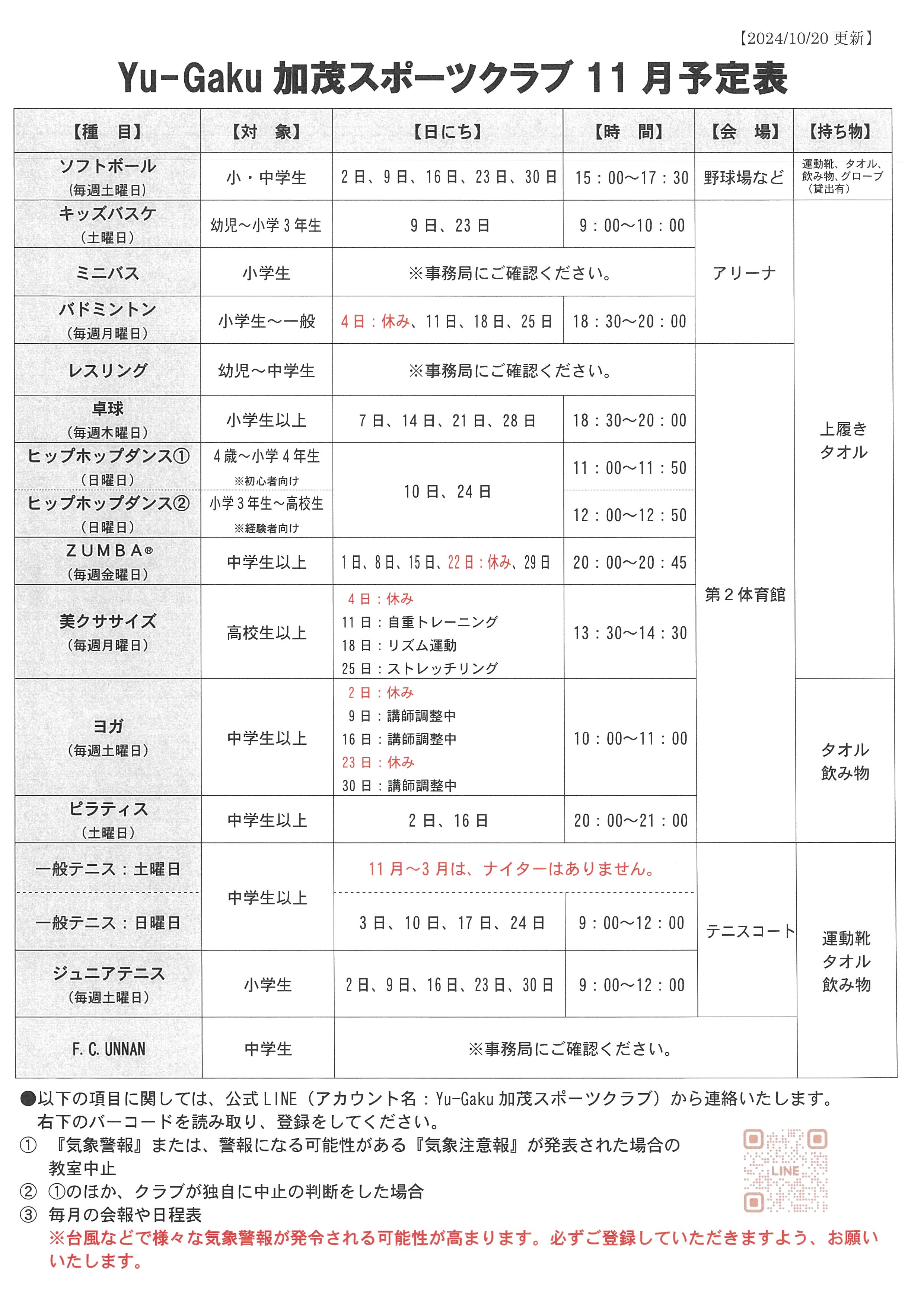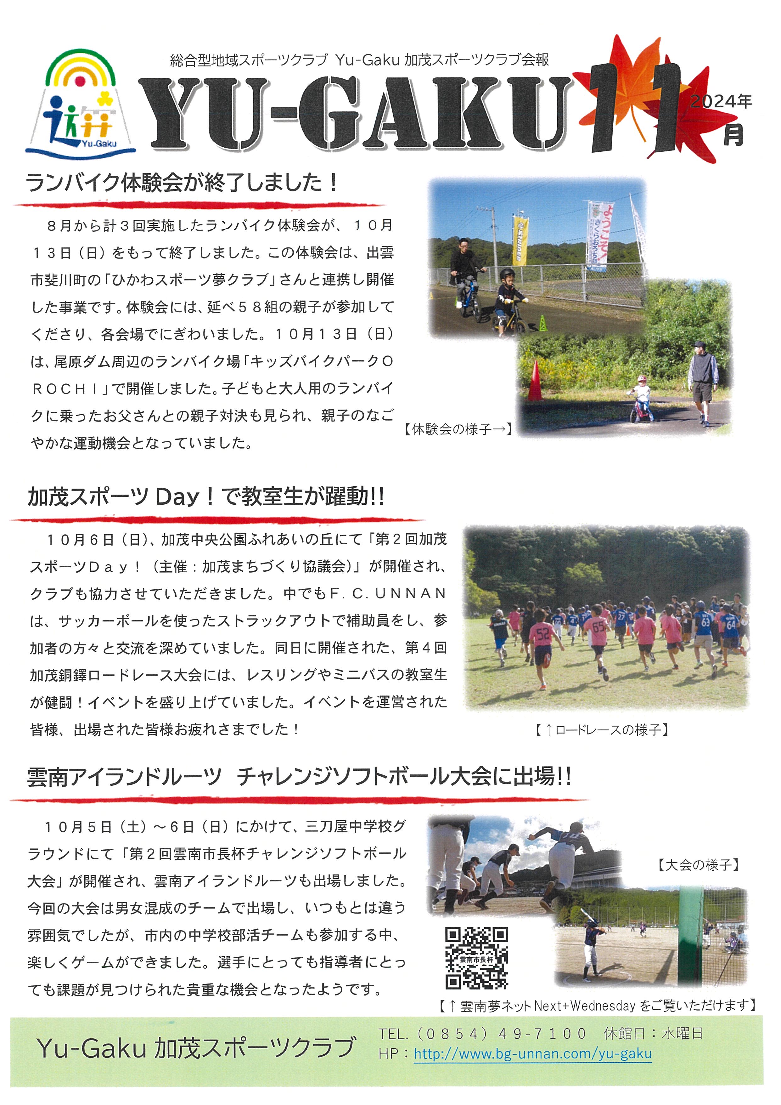 Yu-Gaku加茂スポーツクラブ会報11月号&日程表について 更新日:2024年10月20日 Yu-Gaku加茂スポーツクラブの教室にご参加いただきありがとうございます。11月会報と日程表をアップします!ご確認ください!
