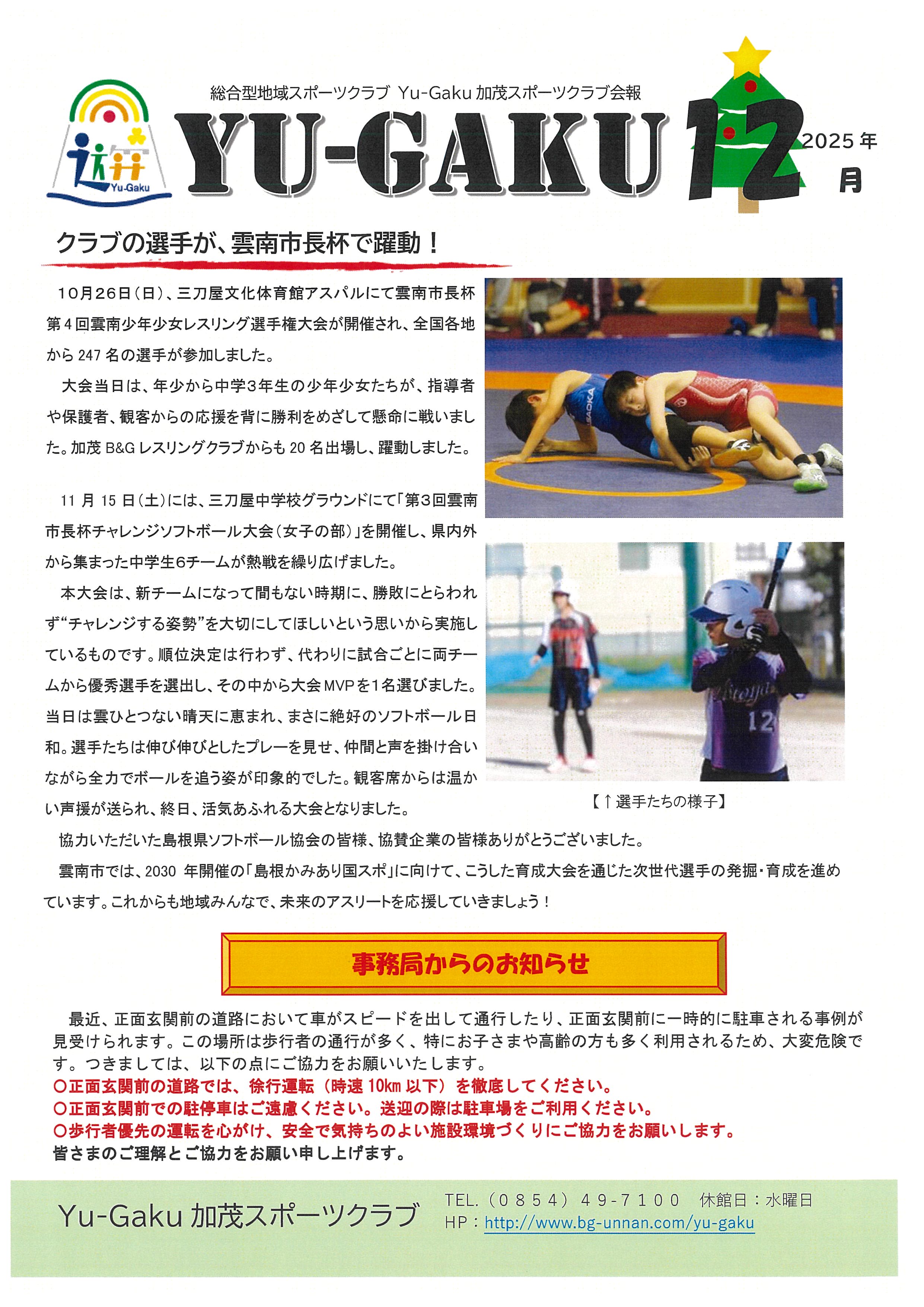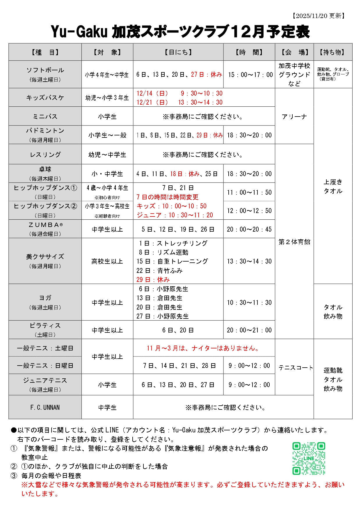 Yu-Gaku加茂スポーツクラブ会報12月号&日程表について 更新日:2025年11月29日 Yu-Gaku加茂スポーツクラブの教室にご参加いただき、ありがとうございます。会報12月号と日程表を掲載いたします。※会員の方は公式LINEを必ずご登録ください。毎月の日程表や、急な休講、日程変更などは公式LINEでご連絡いたします。毎月発行している日程表の下部の二次元バーコードを読み取り、ご登録ください。