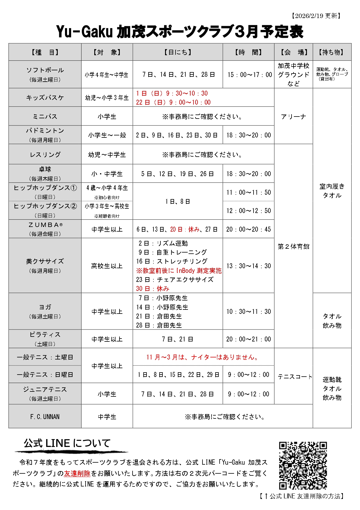 令和7年度をもってスポーツクラブを退会される方は、公式LINE「Yu-Gaku加茂スポーツクラブ」の友達削除をお願いいたします。方法は以下のURLをご確認ください。
