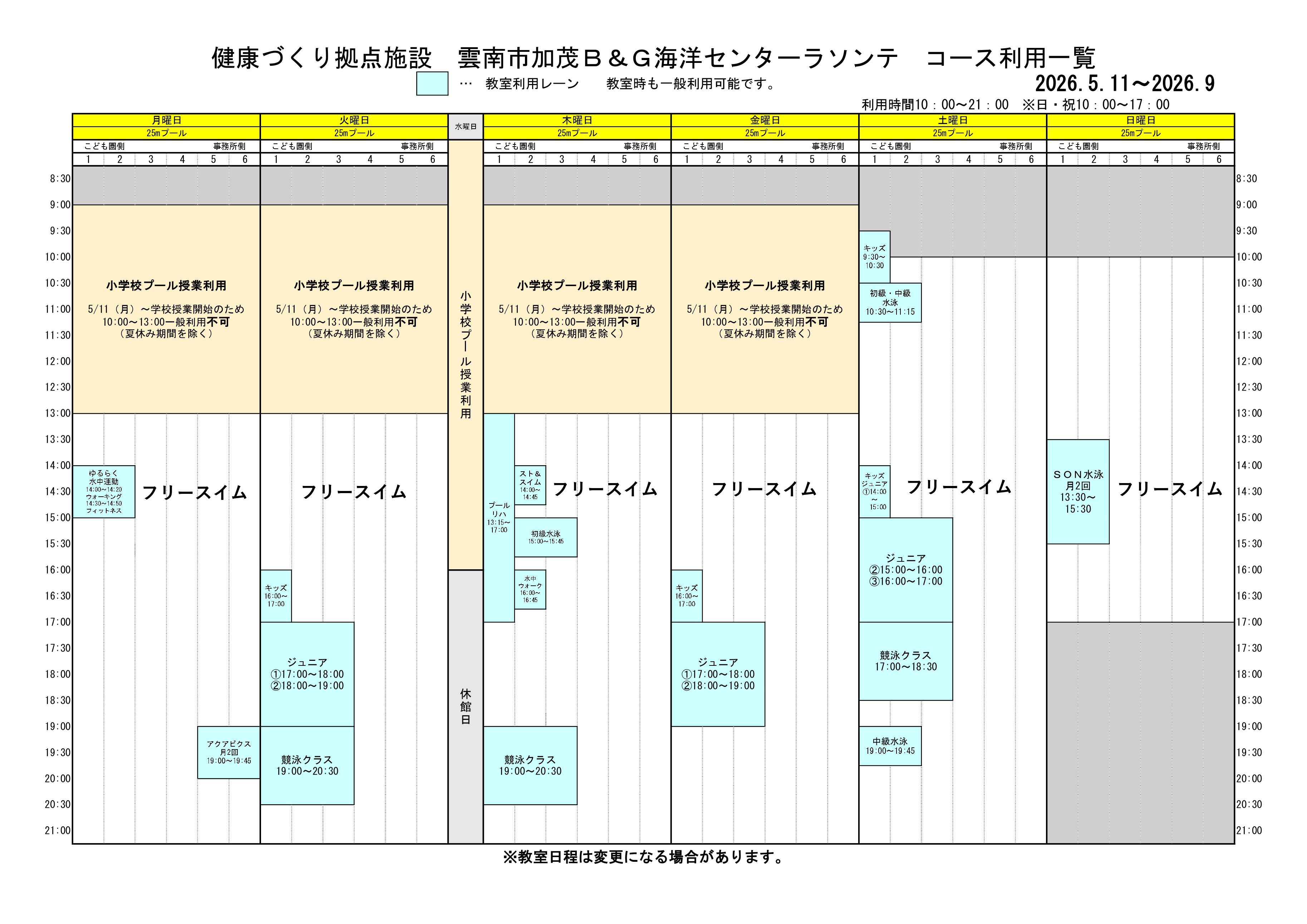 プールコース利用一覧について(令和8年4月~9月) 更新日:2026年4月6日 令和8年度4月~9月末のコース利用一覧です。 5月中旬ごろから雲南市小中学校のプール授業(午前中)がありますので、一般利用は13:00~となります。 ※予定が変更になる可能性があります。ご了承ください。皆様のご理解と、ご協力をお願いいたします。