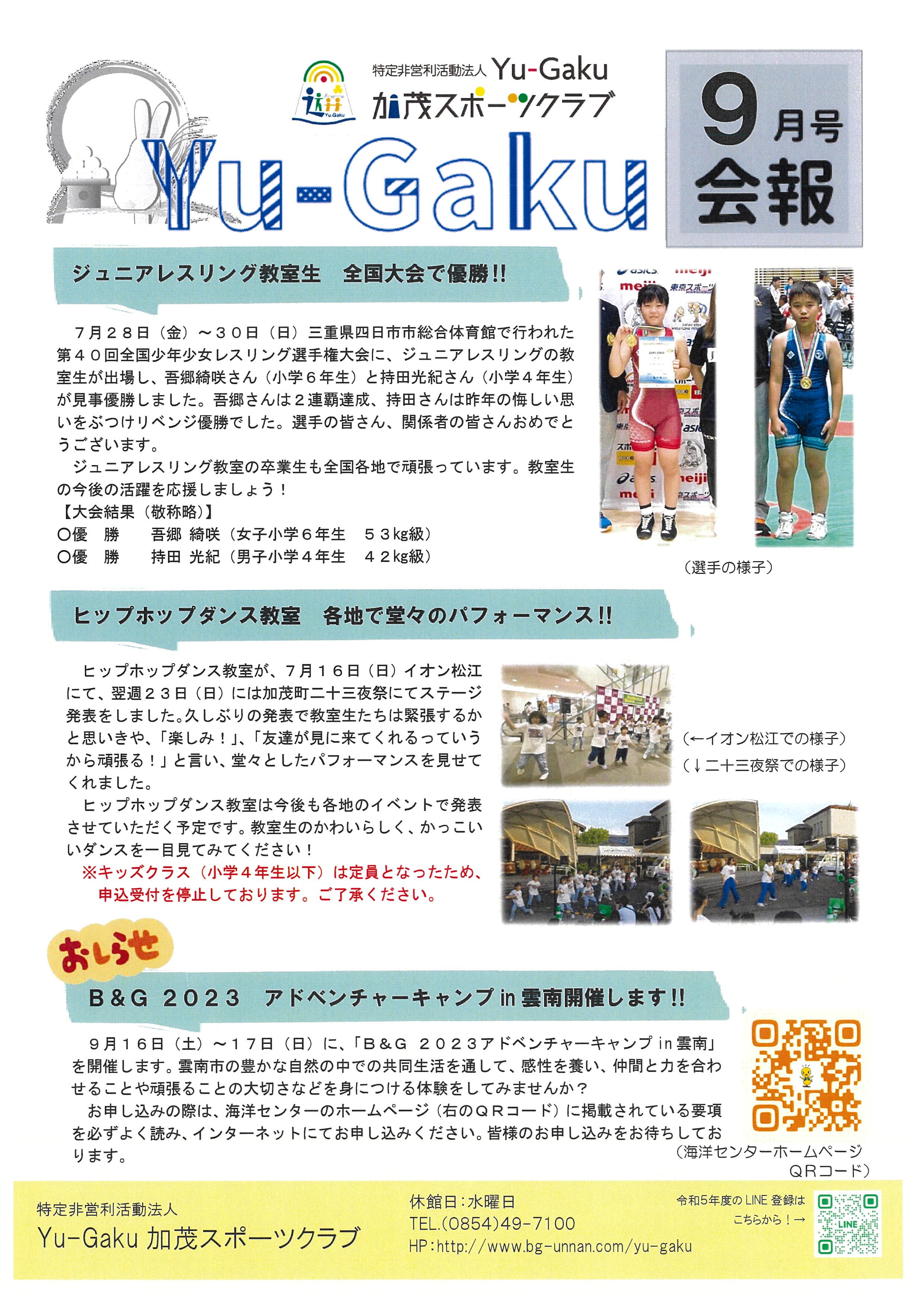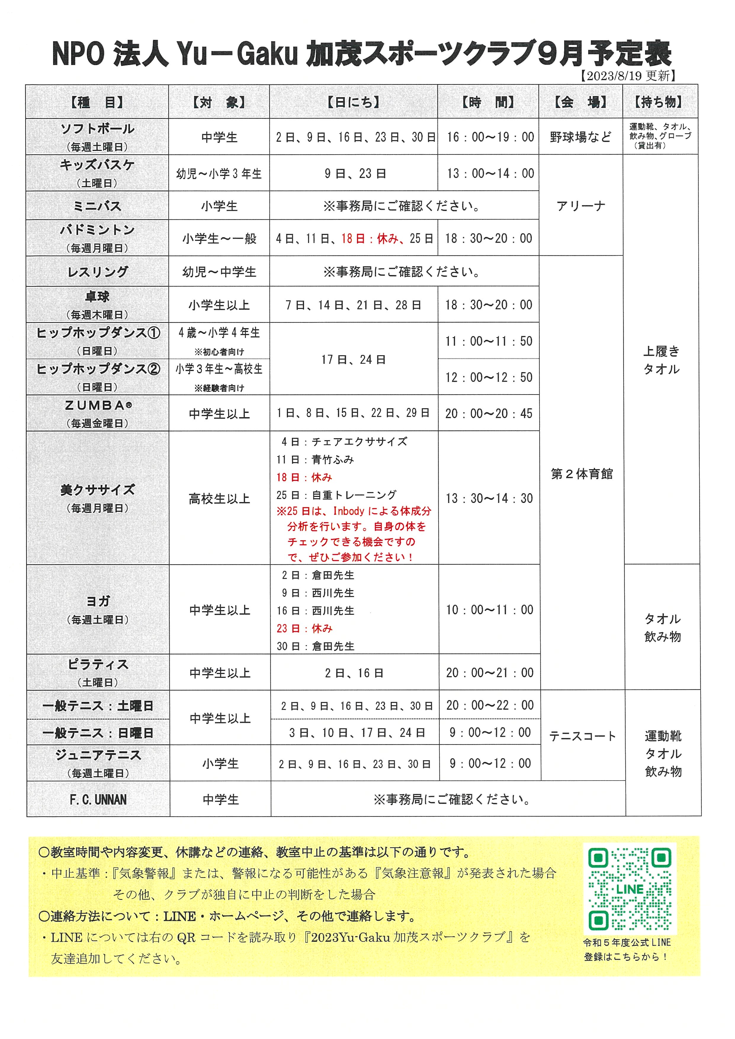 Yu-Gaku加茂スポーツクラブ令和5年9月会報&日程表 更新日:2023年8月18日 Yu-Gaku加茂スポーツクラブの教室にご参加いただき、ありがとうございます。 令和5年9月の会報と日程表をアップします。ご確認ください。